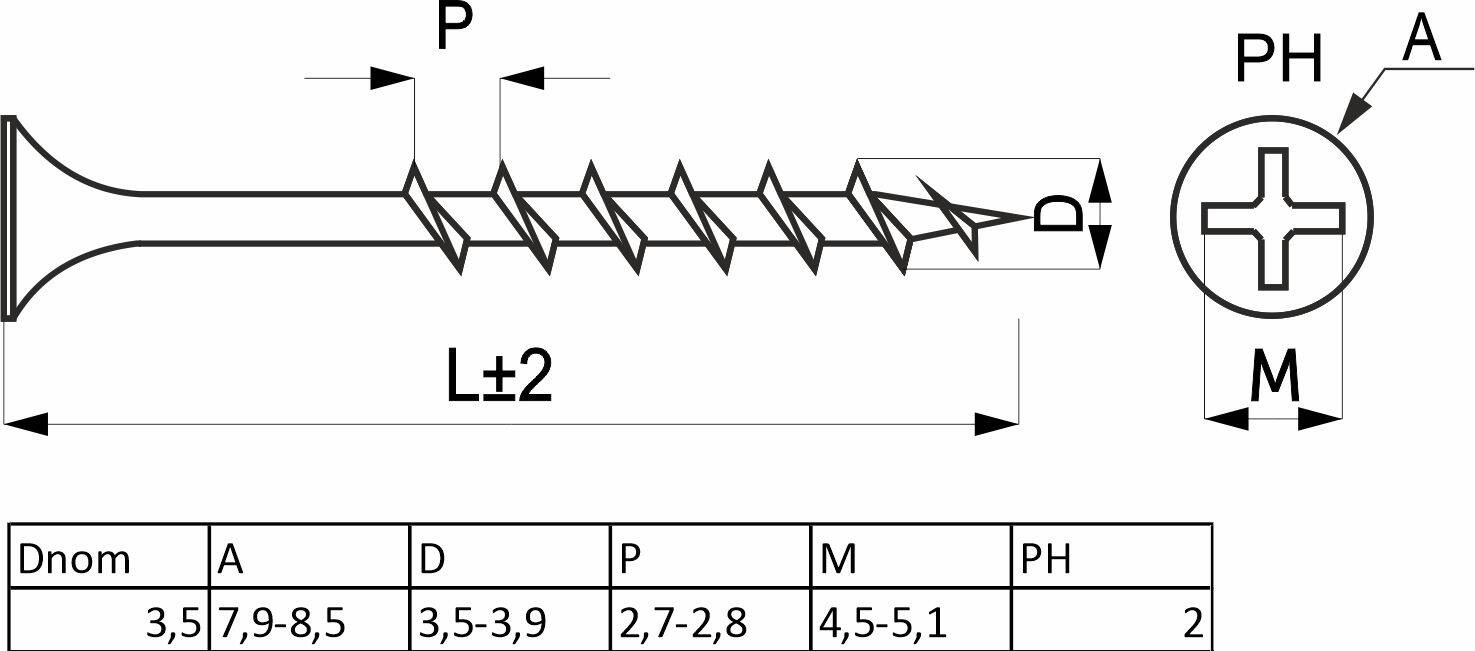 Материал: сталь. Потайная головка, крестообразный шлиц, оксидированные. Саморез для гипсокартона для крепления к дереву имеет крупный шаг резьбы и шлиц PH. Материал покрытия стальных стержней саморезов для гипсокартона - фосфатное (черные).