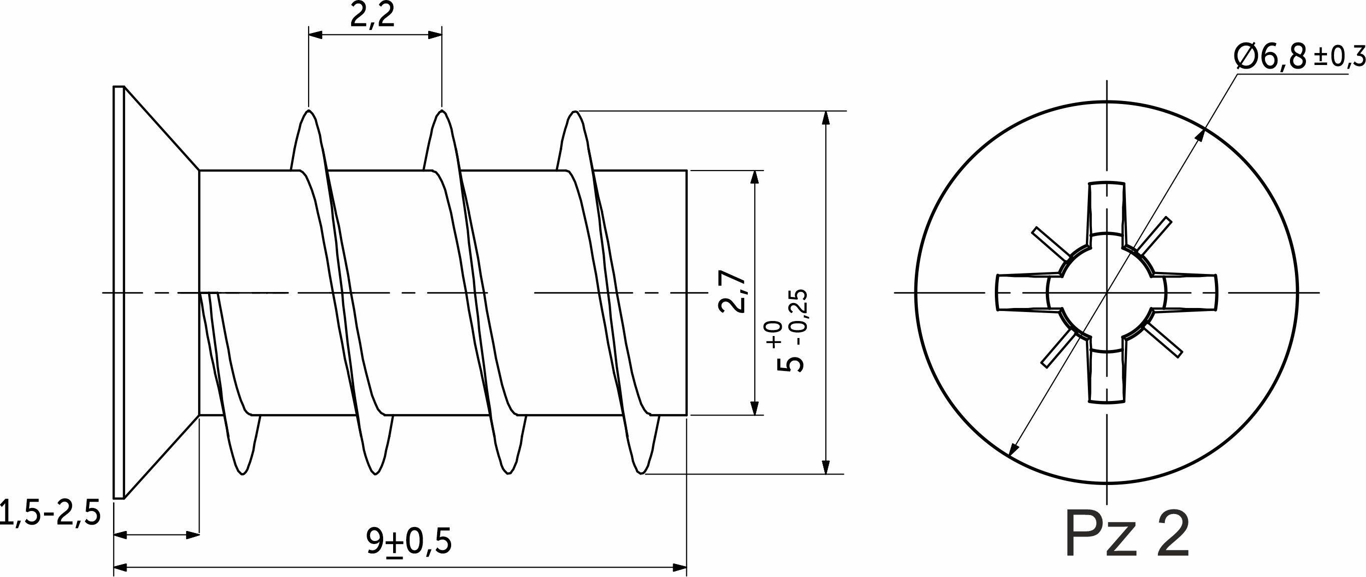 Евро-шуруп (ES) имеет потайную головку, диаметр стержня 5 мм и тупой наконечник. Чаще всего применяется для крепления направляющих к боковым стенкам мебели. Длина 9 мм (длина данного шурупа считается как полная длина всего изделия).