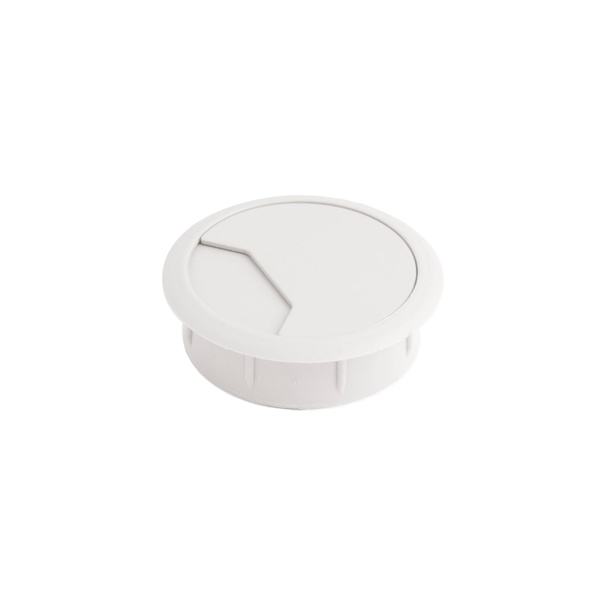 Пропуск кабельный пластиковый врезной. Габаритный диаметр изделия 70мм, размеры отверстия в столешнице - d60мм. Внутри пропуска есть съемная крышка, которая частично либо полностью закрывает отверстие для кабеля.