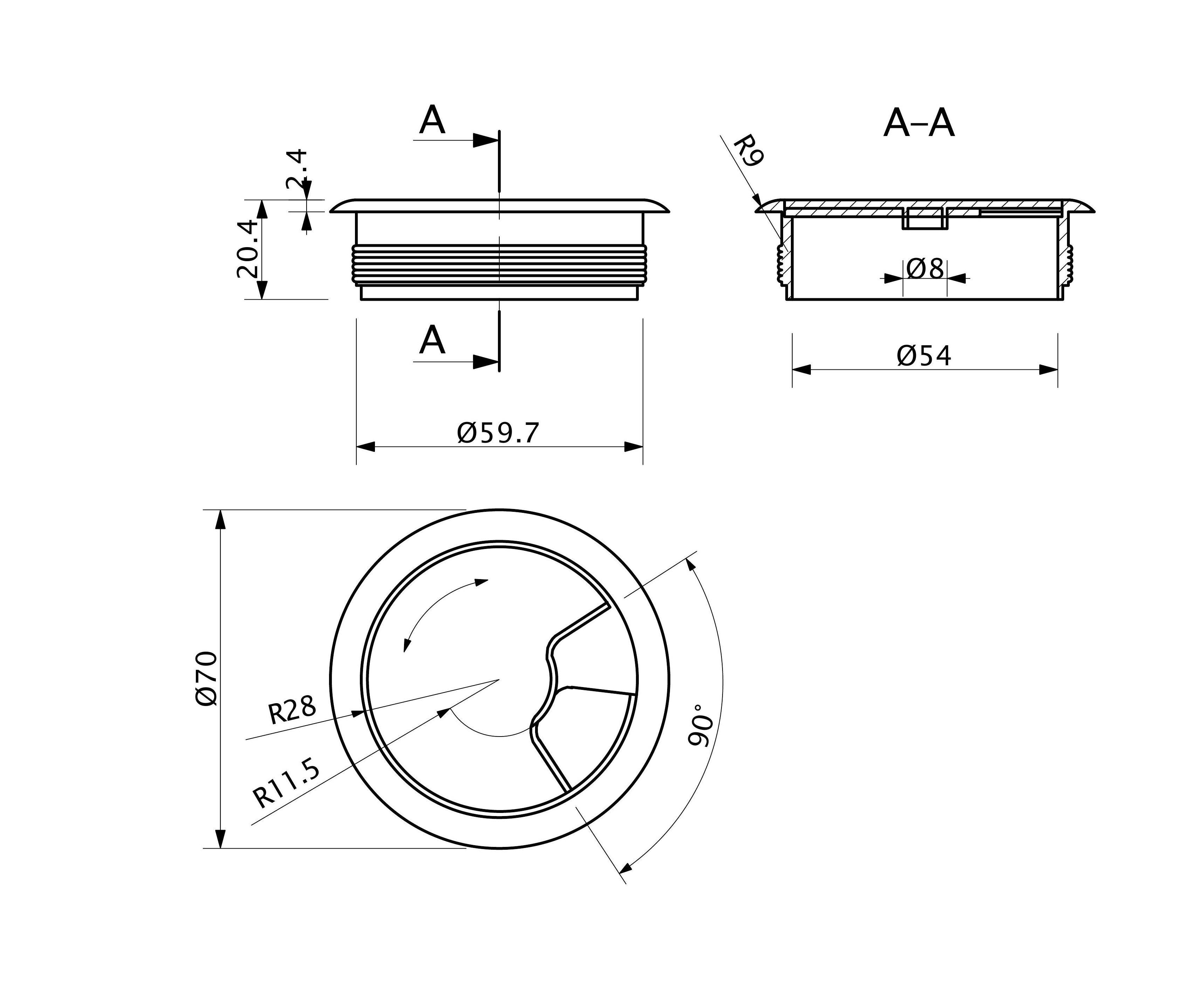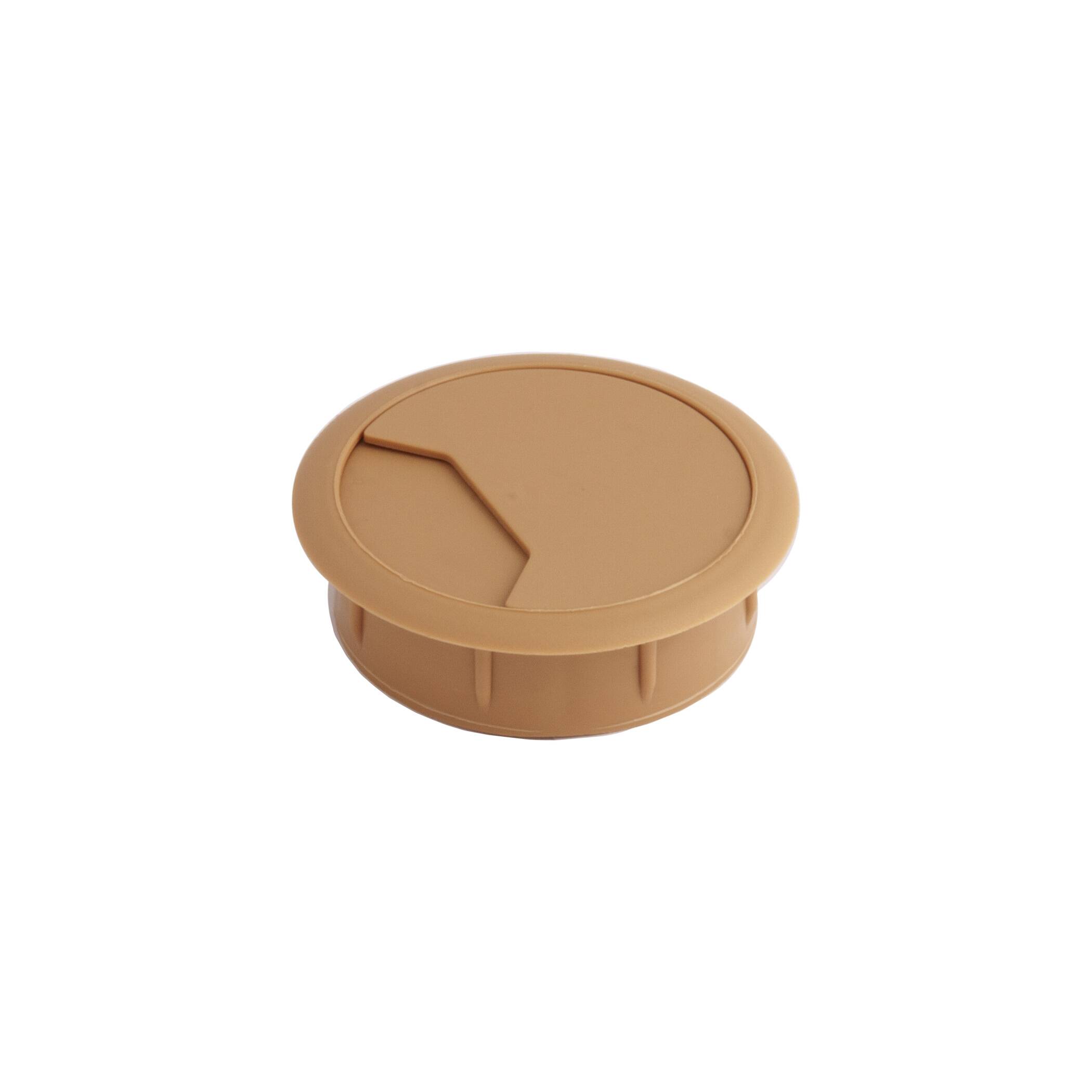 Пропуск кабельный пластиковый врезной. Габаритный диаметр изделия 70мм, размеры отверстия в столешнице - d60мм. Внутри пропуска есть съемная крышка, которая частично либо полностью закрывает отверстие для кабеля.