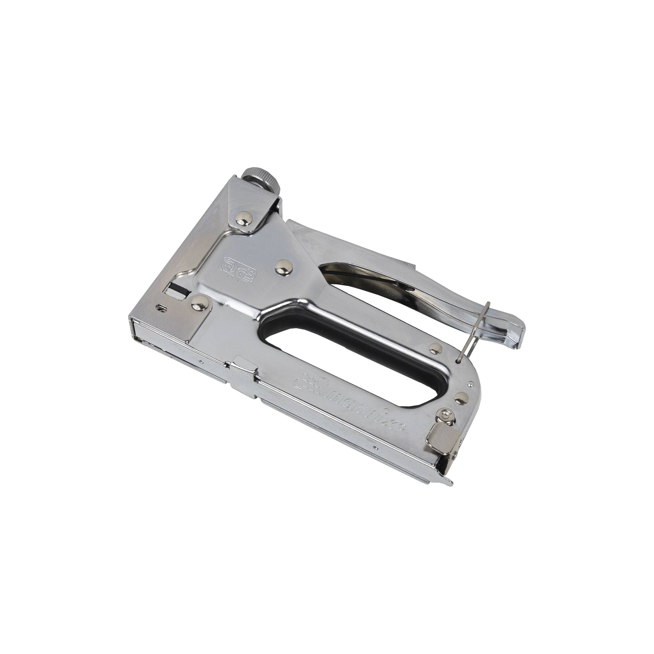Под скобы 4-14 мм. Скобозабивной пистолет предназначен для обивки тканью и сшивания тонких материалов: фанеры, картона, крепления пленки или металлической сетки к деревянному каркасу.