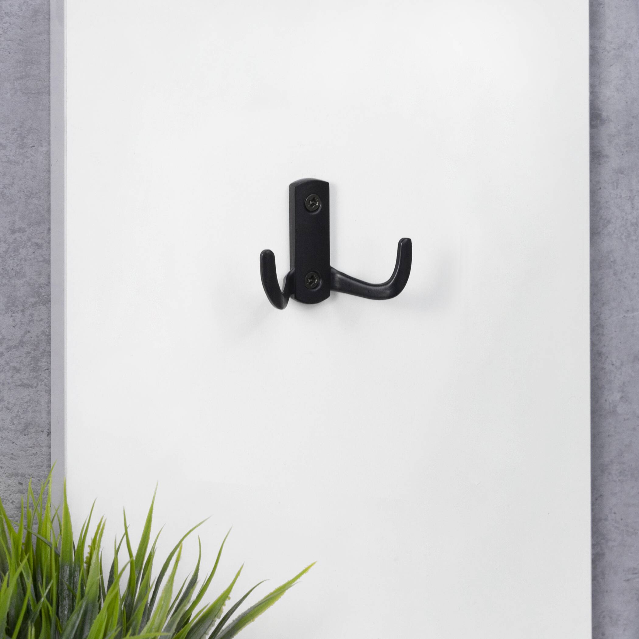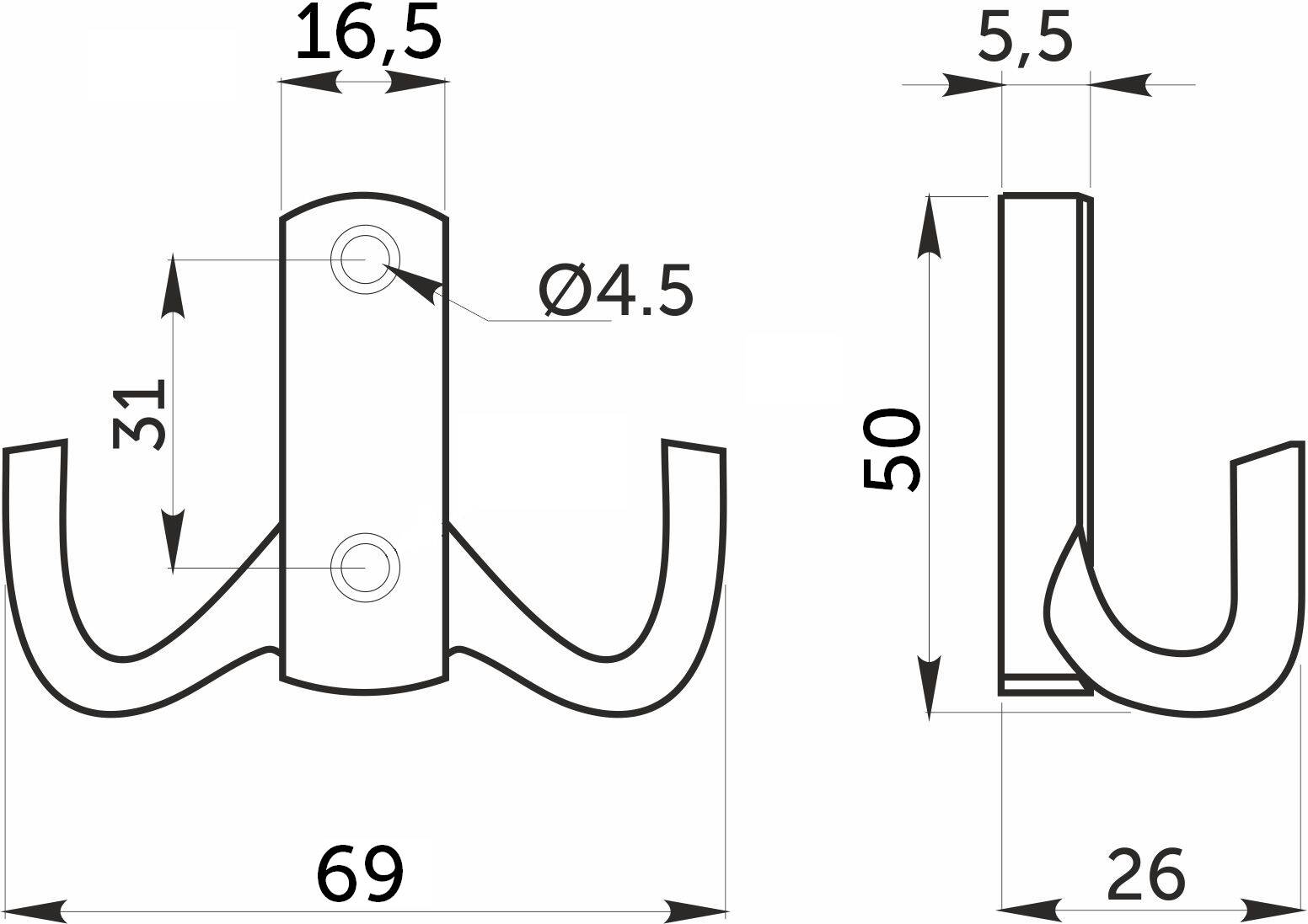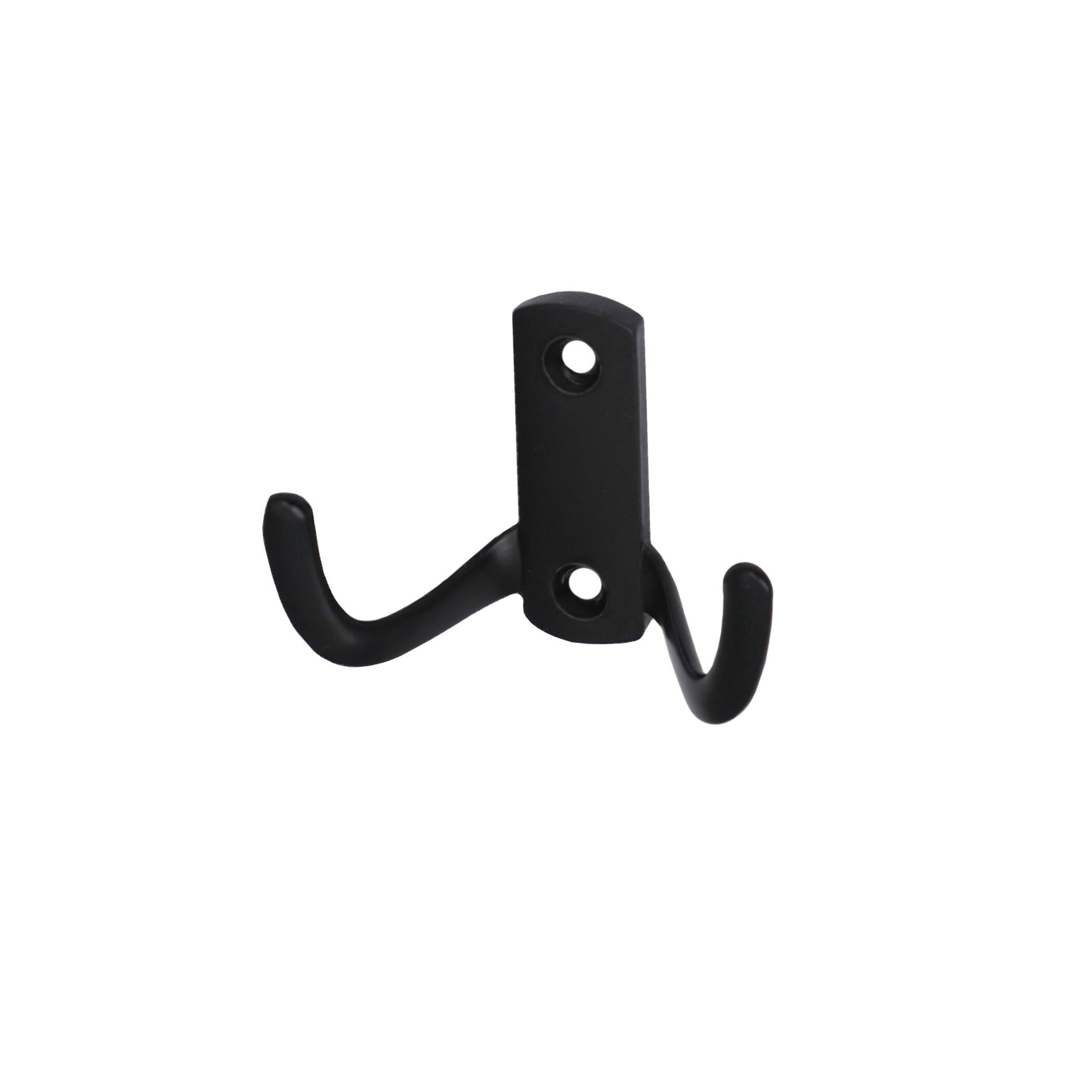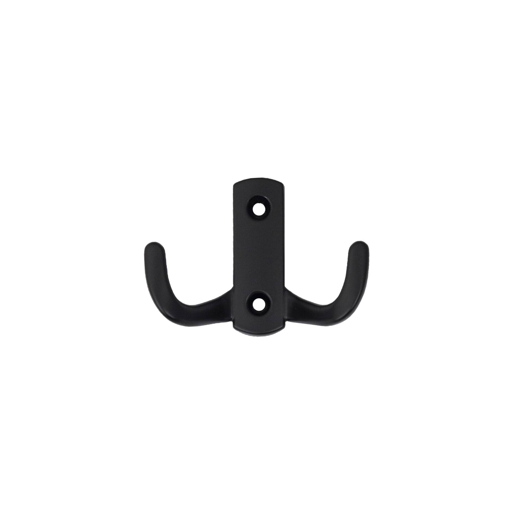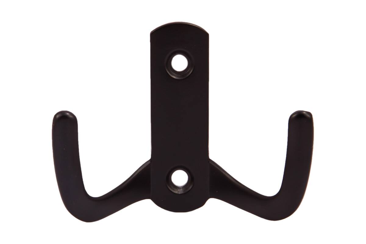 Металлический двухрожковый крючок. Подходит для использования в ванных и гардеробных комнатах. Материал - цинк-алюминий. Цвет - черный. Крепление к поверхности с помощью шурупов. В комплекте: 2 шурупа 4*18. Максимальная нагрузка - 20кг.