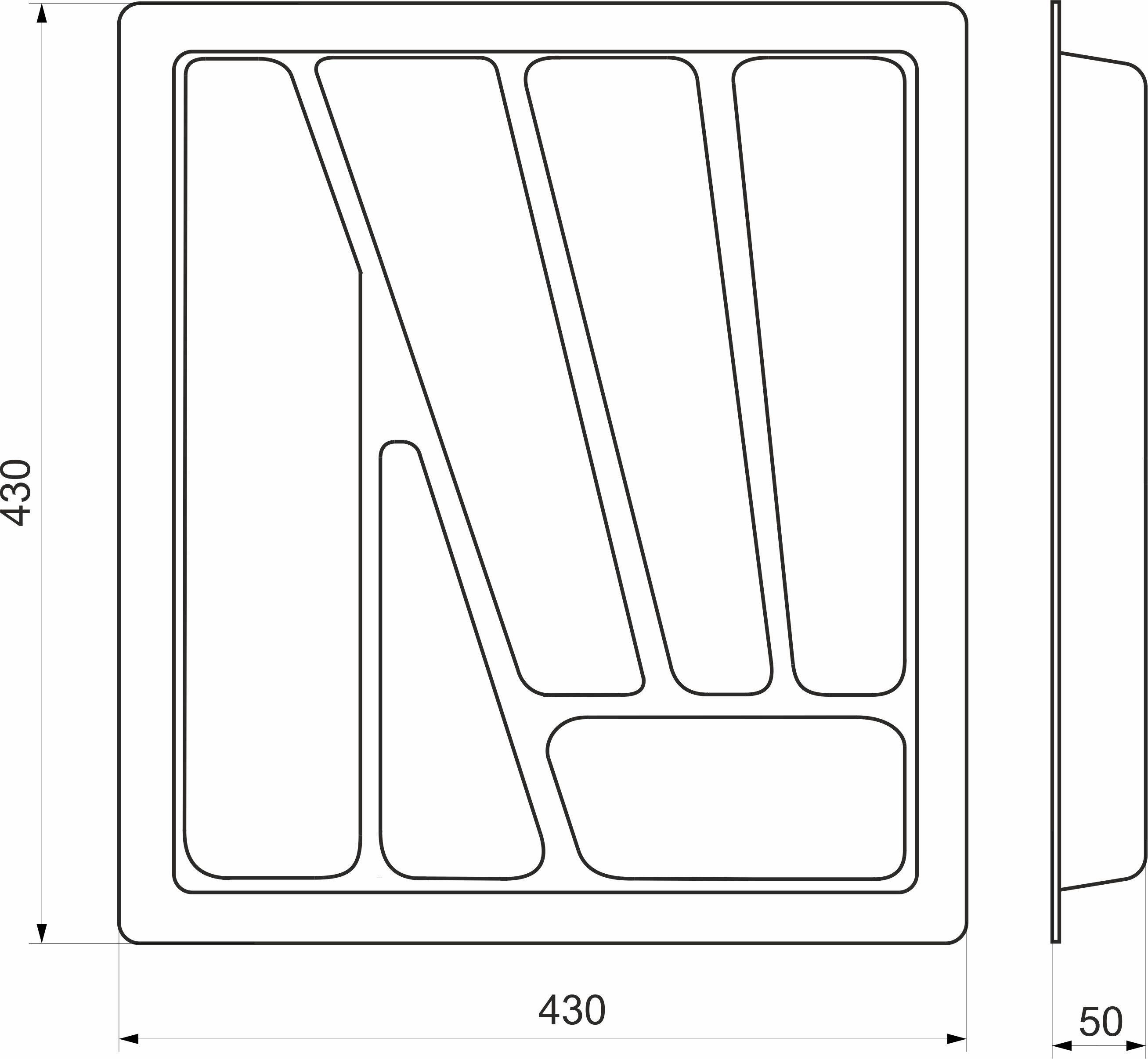 Вкладыш VERSO 50/430 используется для размещения кухонных принадлежностей. Многофункциональный и вместительный, выполнен из пищевого пластика. Цвет: металлик. Для того, чтобы определиться с выбором, необходимо знать размер ящика (ширину и глубину)