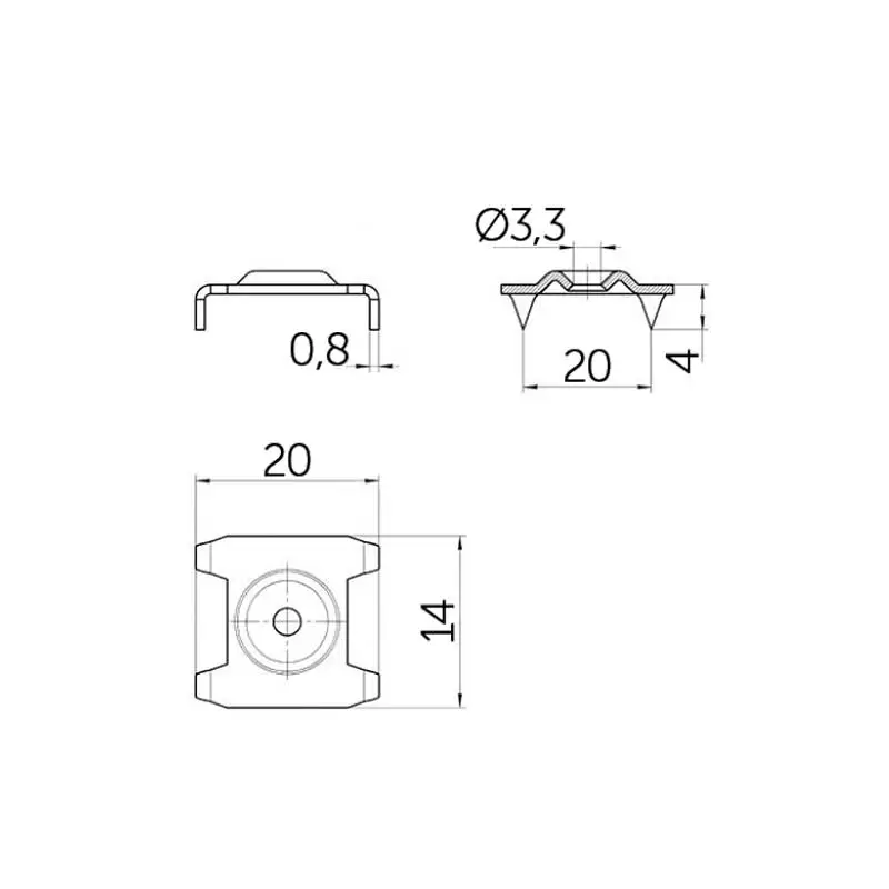 Шайба-скрепка металлическая предназначена для крепления задних стенок ДВП между собой. Зубья шайбы-скрепки "впиваются" в два состыкованных между собой листа ДВП, а через центральное отверстие в шайбе с помощью самореза происходит притягивание соединения к корпусу изделия. Толщина металла 0,8 мм, размер самой шайбы 14мм*20мм.