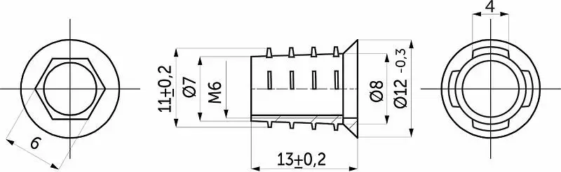 Данная гайка имеет внутреннюю резьбу М6, общую длину 13 мм и шлиц под 6-гранный ключ соответствующего размера.