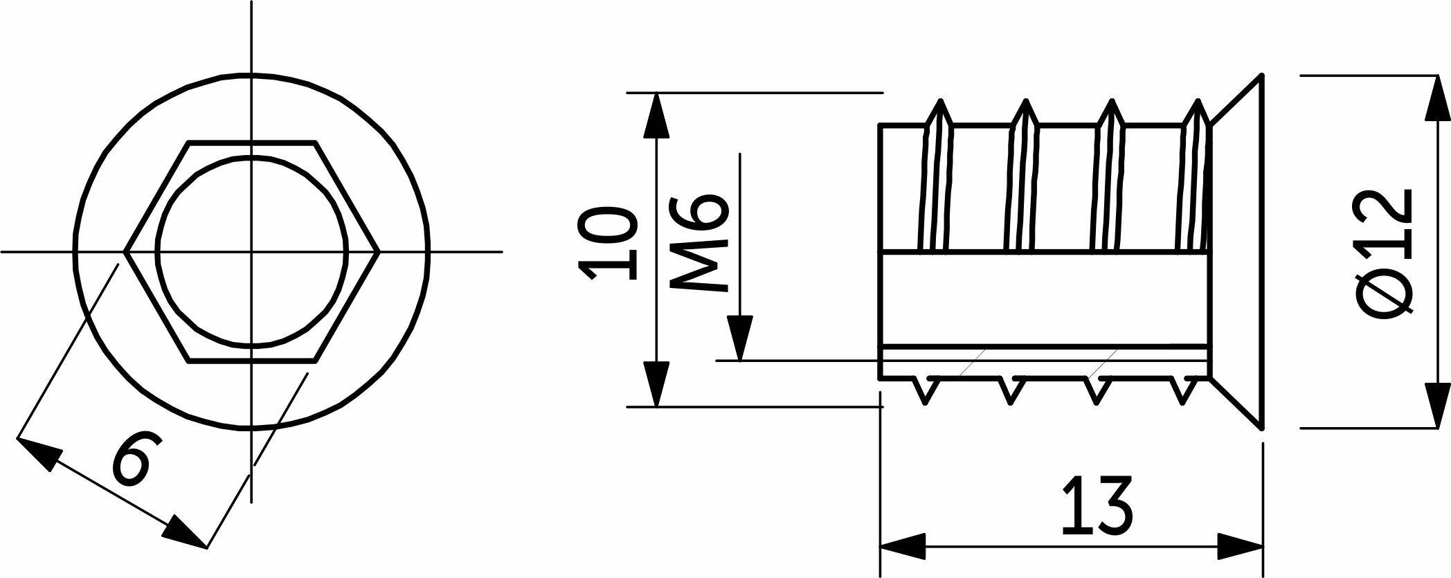 Данная гайка имеет внутреннюю резьбу М6, общую длину 13 мм и шлиц под 6-гранный ключ соответствующего размера.