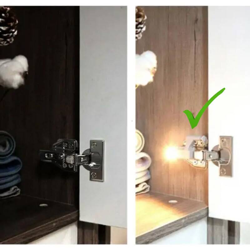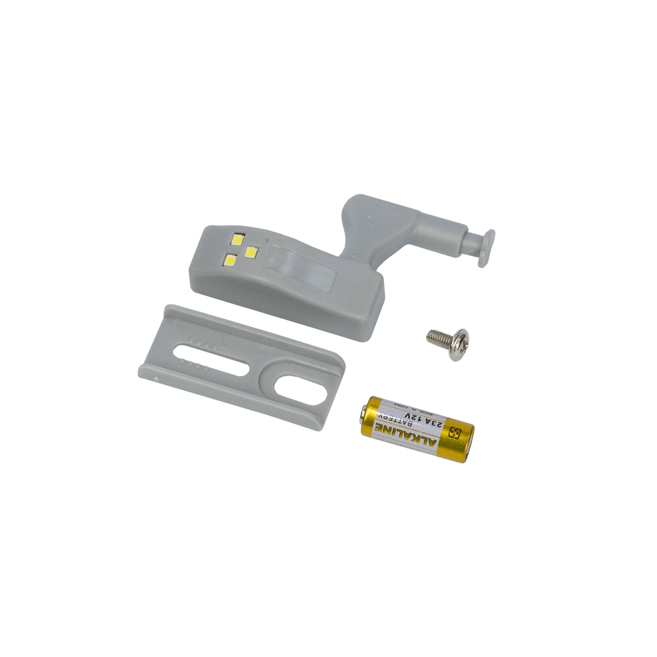 Накладка для мебельных петель с подсветкой комплектуется: Накладка с подсветкой, крепление для петли, винт монтажный, батарейка. напряжение 12В, мощность 0,25 Вт.