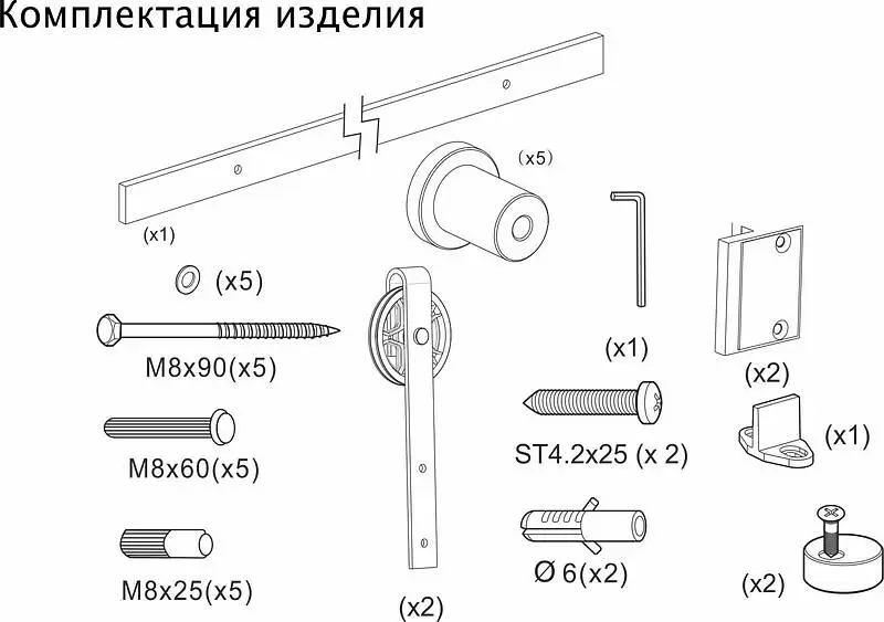 1 комплект = ролик верхний RONDO - 2шт., направляющая - 2м.п., стопор для верхней направляющей - 2шт., крепление направляющей к стене - 5шт., проводник нижний - 1шт., стопор, предотвращающий выскальзывание дверей из направляющих (антиджампинг) - 2шт., крепеж.