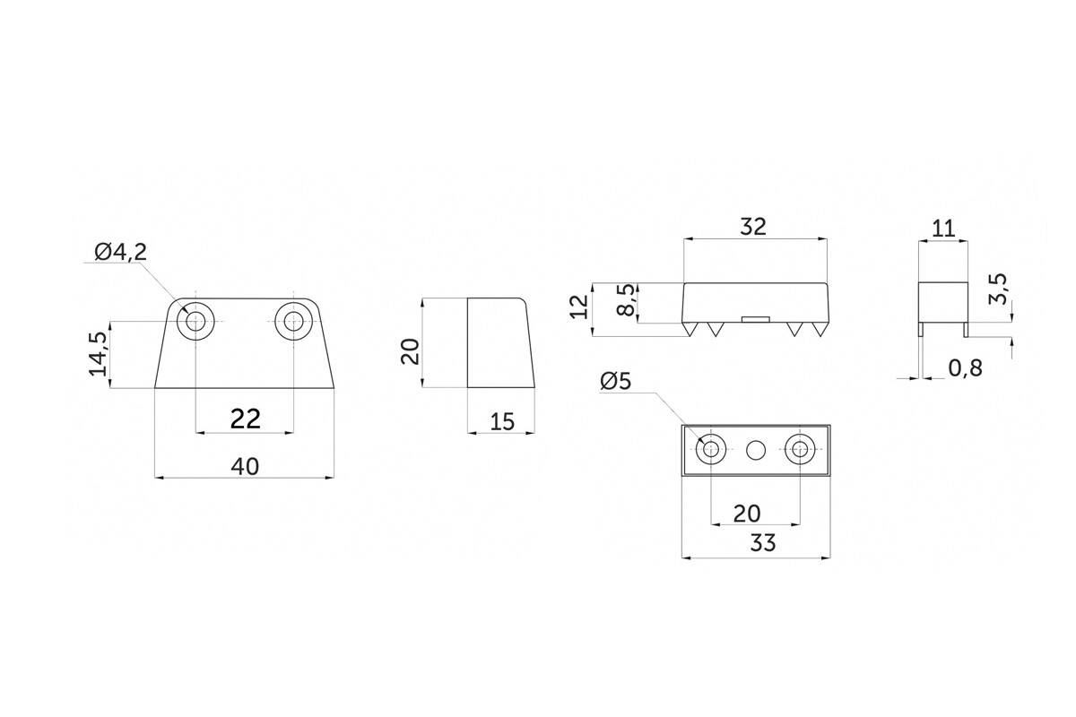 Комплект трапециевидной стяжки состоит из корпуса стяжки, ответной скобы и винта. Данная стяжка применяется для сборки под прямым углом мебельных корпусов и рассчитана на высокие нагрузки. За счет своей конструкции трапециевидная стяжка создаёт между деталями идеально прямой угол, что сводит на минимум производственные погрешности. Монтаж осуществляется следующим образом: сначала с помощью саморезов закрепляется ответная скоба на боковине изделия. Затем к полке изделия закрепляется корпус стяжки (также с помощью саморезов). Потом необходимо собрать детали простым наложением. Между собой корпус стяжки соединяется поставляющимся в комплекте евровинтом. Комплект: 1 накладка, 1 крепление, 1 еврошуруп