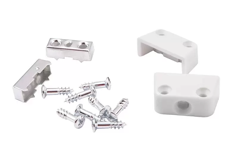 Комплект трапециевидной стяжки состоит из корпуса стяжки, ответной скобы и винта. Данная стяжка применяется для сборки под прямым углом мебельных корпусов и рассчитана на высокие нагрузки. За счет своей конструкции трапециевидная стяжка создаёт между деталями идеально прямой угол, что сводит на минимум производственные погрешности. Монтаж осуществляется следующим образом: сначала с помощью саморезов закрепляется ответная скоба на боковине изделия. Затем к полке изделия закрепляется корпус стяжки (также с помощью саморезов). Потом необходимо собрать детали простым наложением. Между собой корпус стяжки соединяется поставляющимся в комплекте евровинтом. Комплект: 1 накладка, 1 крепление, 1 еврошуруп