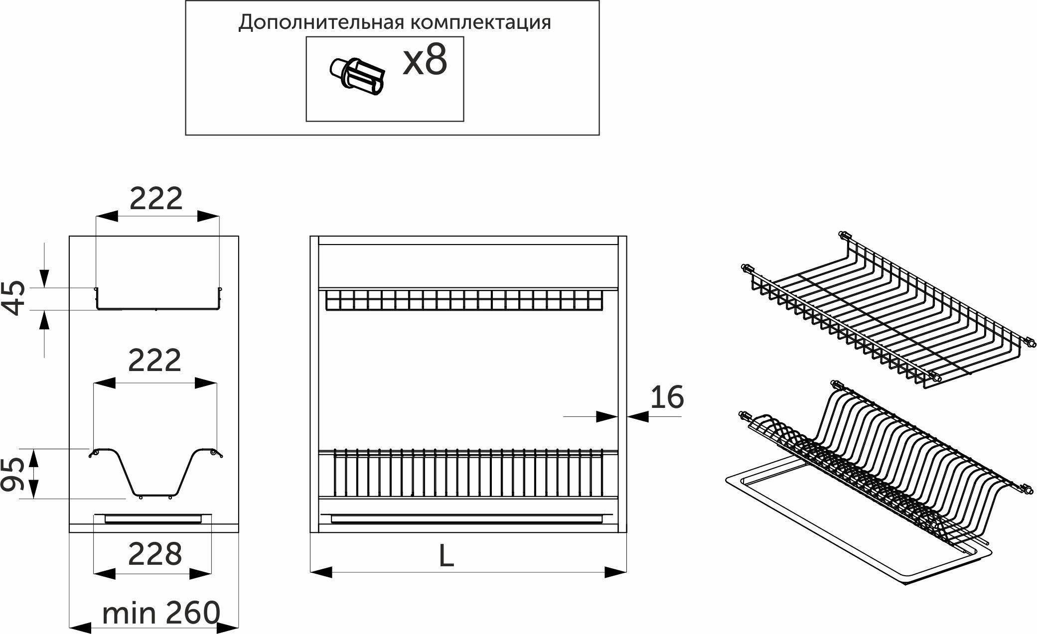 Сушка имеет прут d2,2/4,5мм. Данную модель сушки можно устанавливать в ящик только под ДСП 16 мм. Покрытие – порошковое.
