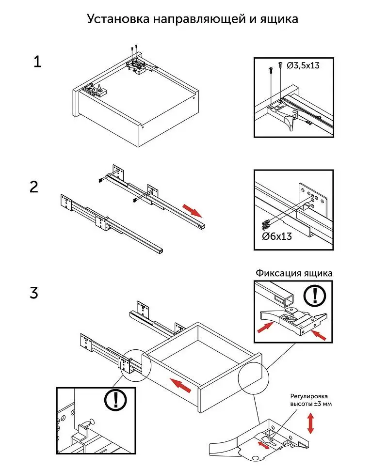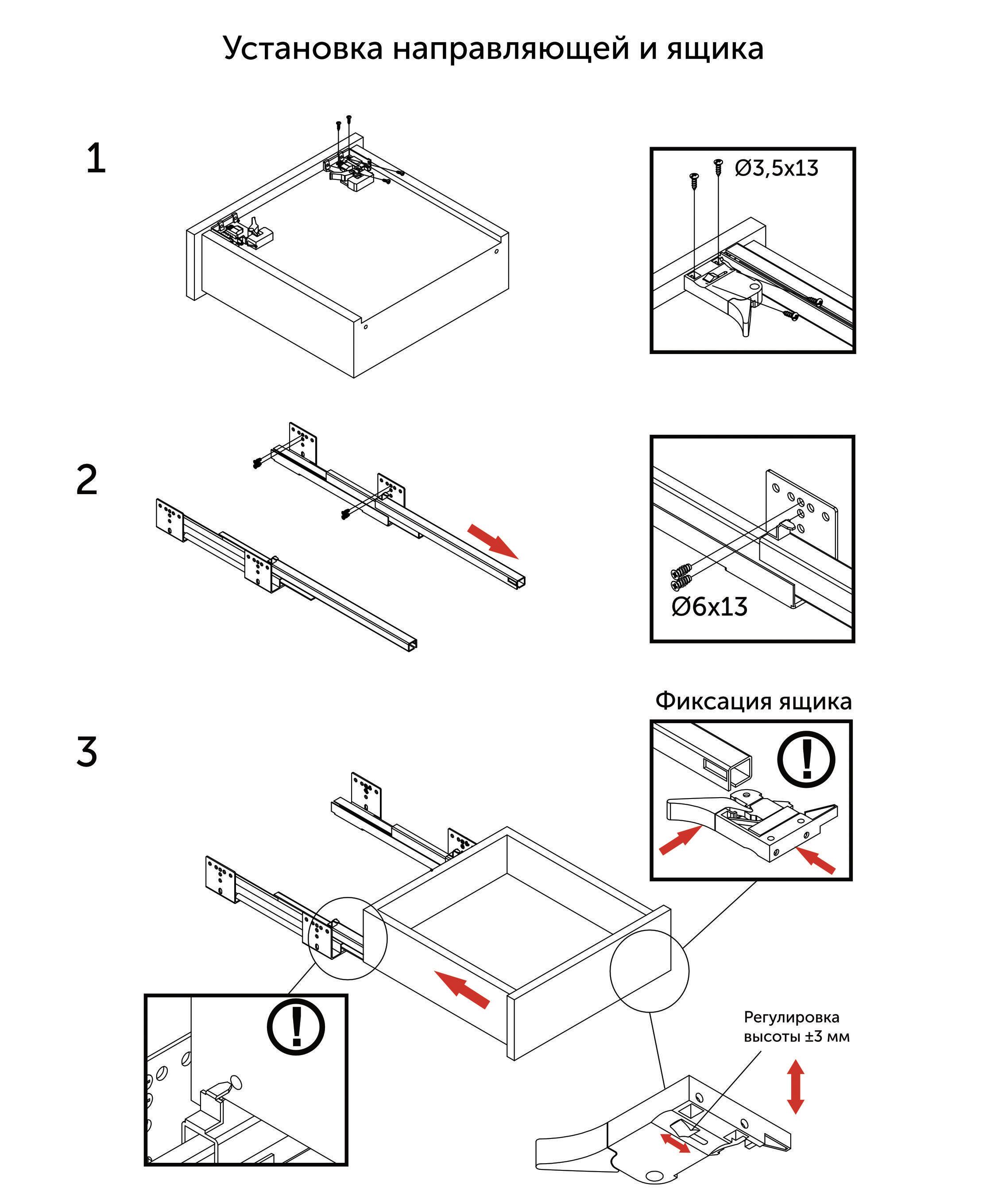 Направляющие предназначены для потайной (под ящиком) установки с минимальным зазором между стенкой корпуса и стенкой ящика (5 мм при использовании ДСП 18 мм). Направляющая выполнена из прочной холоднокатаной стали с ходом в полное выдвижение. Присутствует механизм доводчика и встроенная система синхронизации, что благоприятно сказывается при плавности хода на сверхшироких ящиках . Данные направляющие с гарантированной нагрузкой в 45 кг и циклом жизни в 100 000 открываний / закрываний. Предназначены для систем хранения в шкафах, кухонных гарнитурах и других изделиях, требующих высокий запас прочности. Подходят под все толщины материалов корпуса ящика до 18 мм включительно. Регулирование высоты фронта: + 3 мм