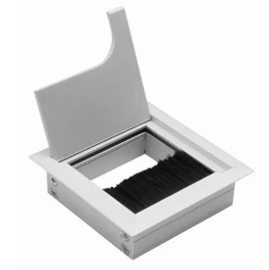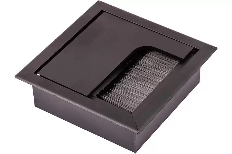 Пропуск кабельный врезной. Габаритные размеры изделия 80х80 мм, размеры отверстия в столешнице - 68,5х68,5мм. Внутри пропуска есть щетка + откидная крышка, которая частично закрывает отверстие для кабеля.