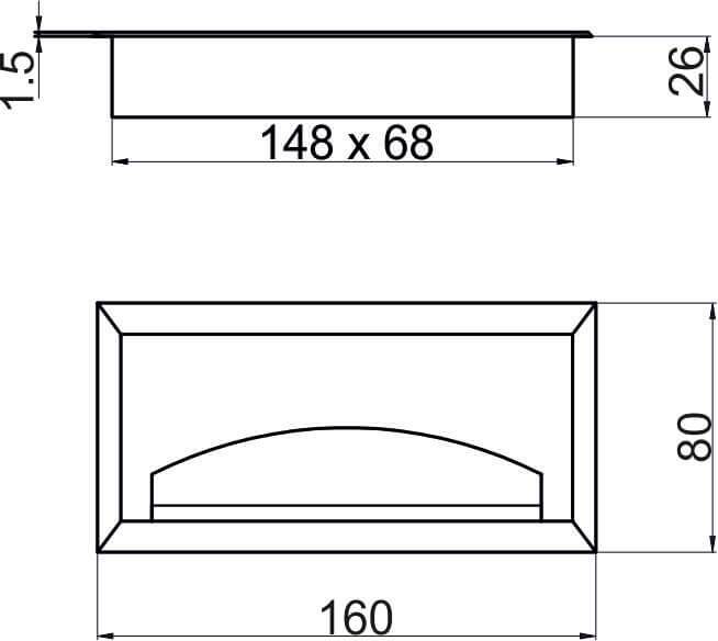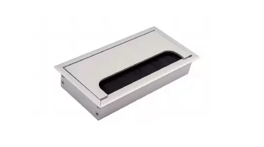 Пропуск кабельный врезной. Габаритные размеры изделия 80х160 мм, размеры отверстия в столешнице - 68х148мм. Внутри пропуска есть щетка + откидная крышка, которая частично закрывает отверстие для кабеля.