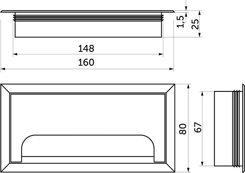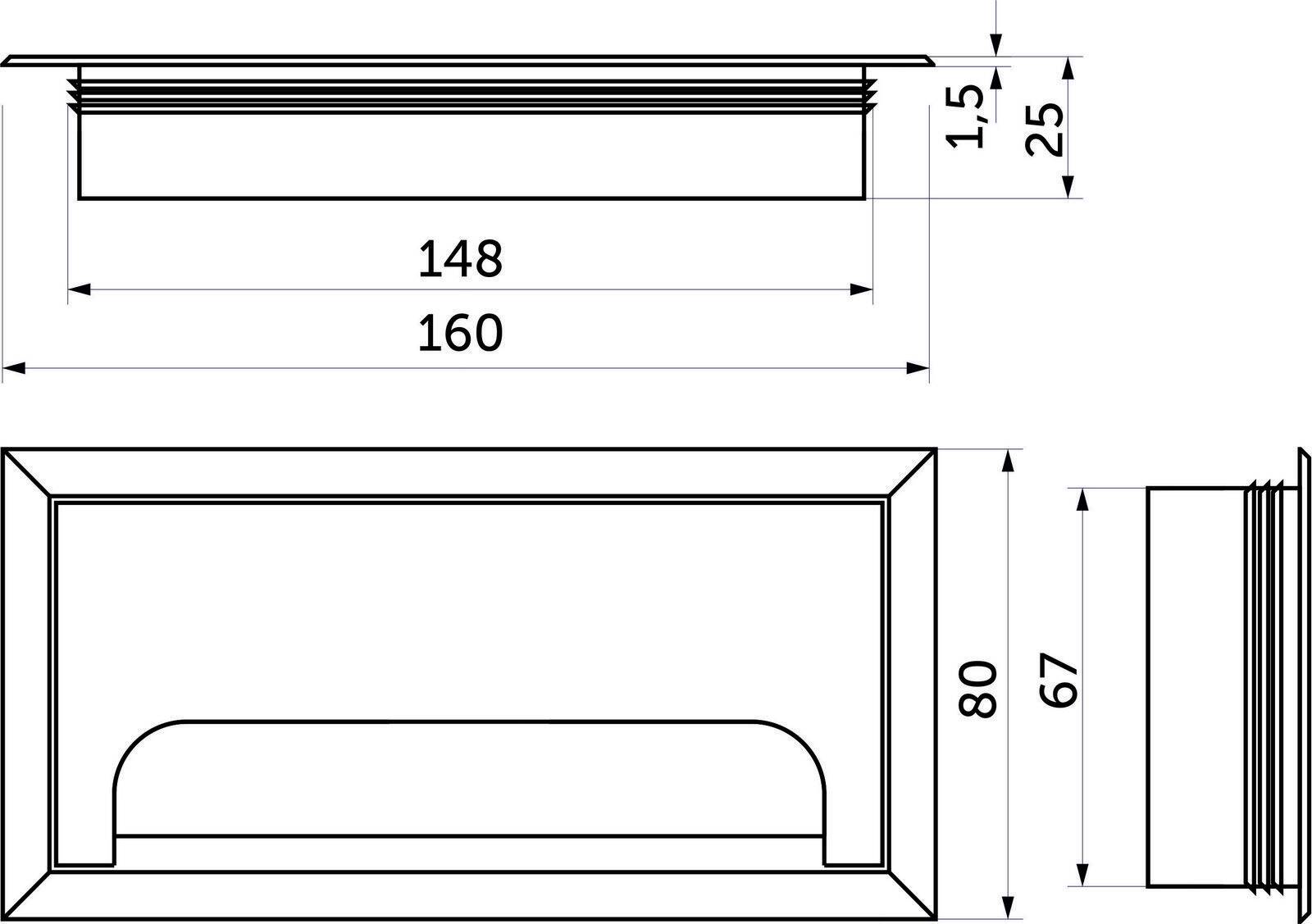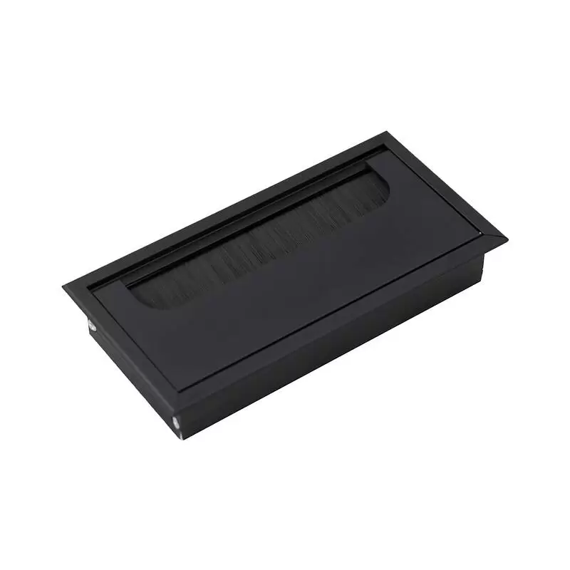 Пропуск кабельный врезной. Габаритные размеры изделия 80х160 мм, размеры отверстия в столешнице - 67х148мм. Внутри пропуска есть щетка + откидная крышка, которая частично закрывает отверстие для кабеля.