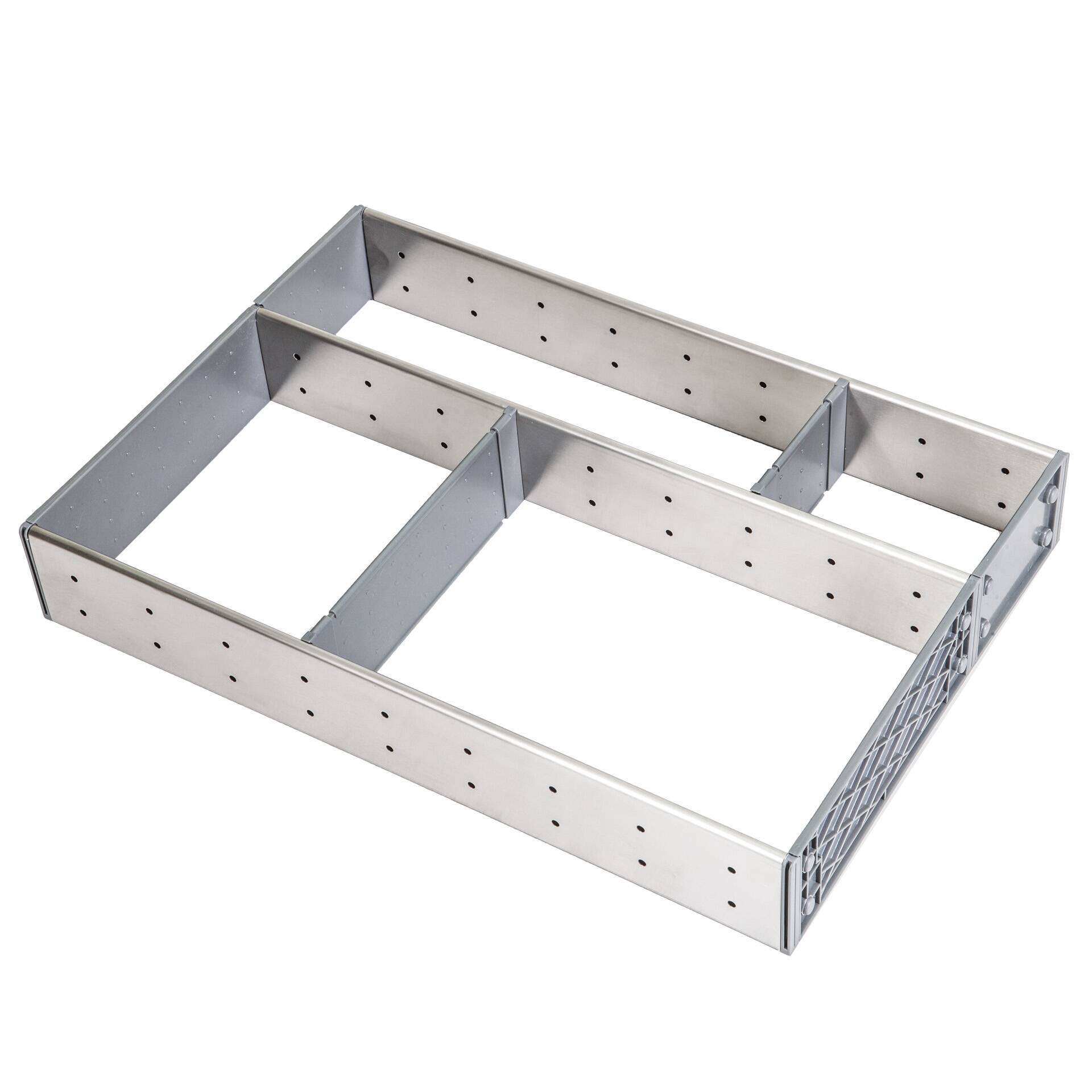 Система внутренних разделителей для ящиков из нержавеющей стали, предназначена для ящика с кухонными аксесуарами, состоит из нескольких ячеек, что позволяет отрганизовать пространство ящика.
