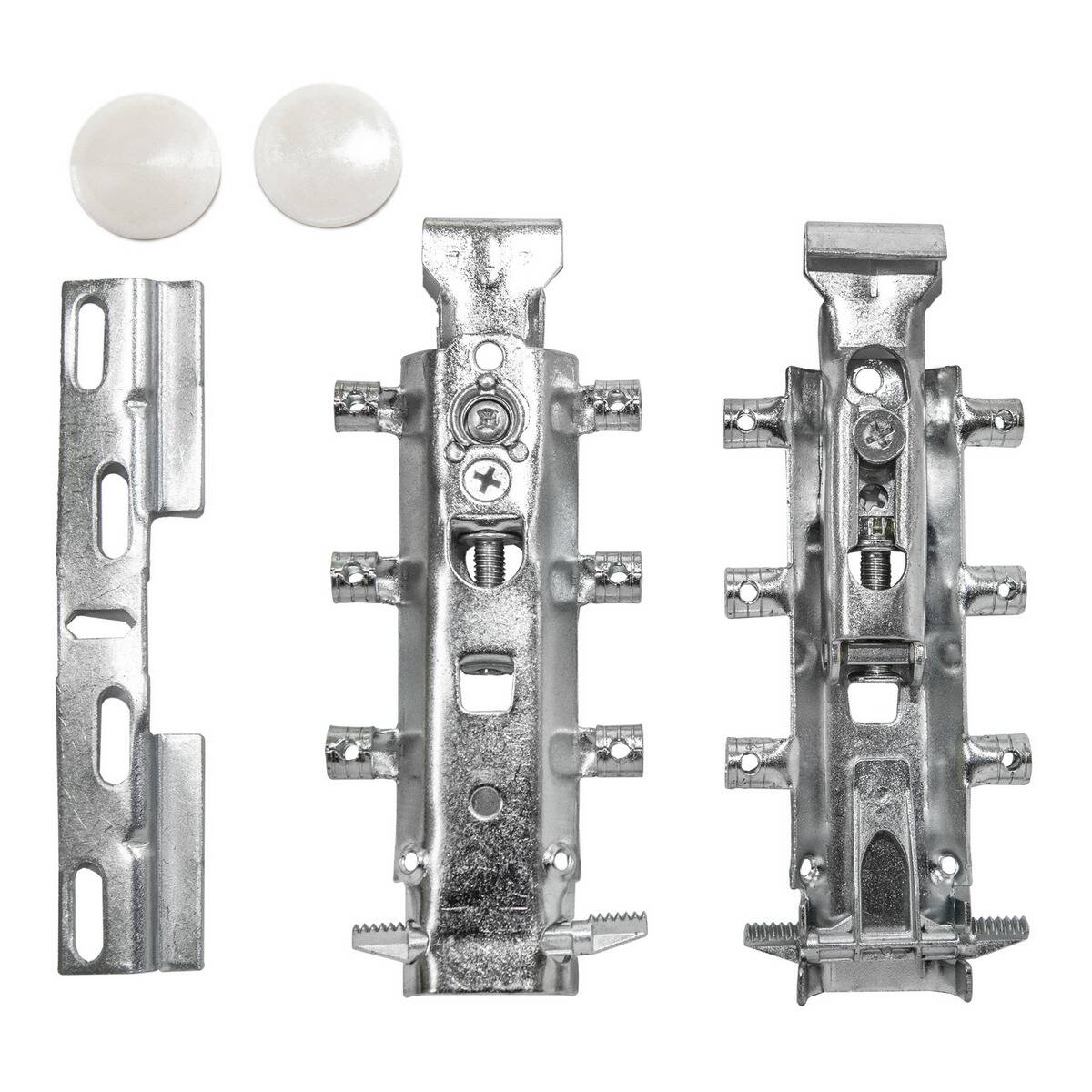 Навес предназначен для крепления ящиков верхнего яруса к стене. Данный навес является регулируемым по высоте на +/- 9 мм и по глубине +/- 5 мм. Нагрузка на пару - 150 кг. В комплект входят 2 навеса, 2 белые заглушки и монтажная шина. Монтаж в отверстия 9,5*12, фиксация на саморезы 3,5*20. При смещении задней стенки от 16 мм