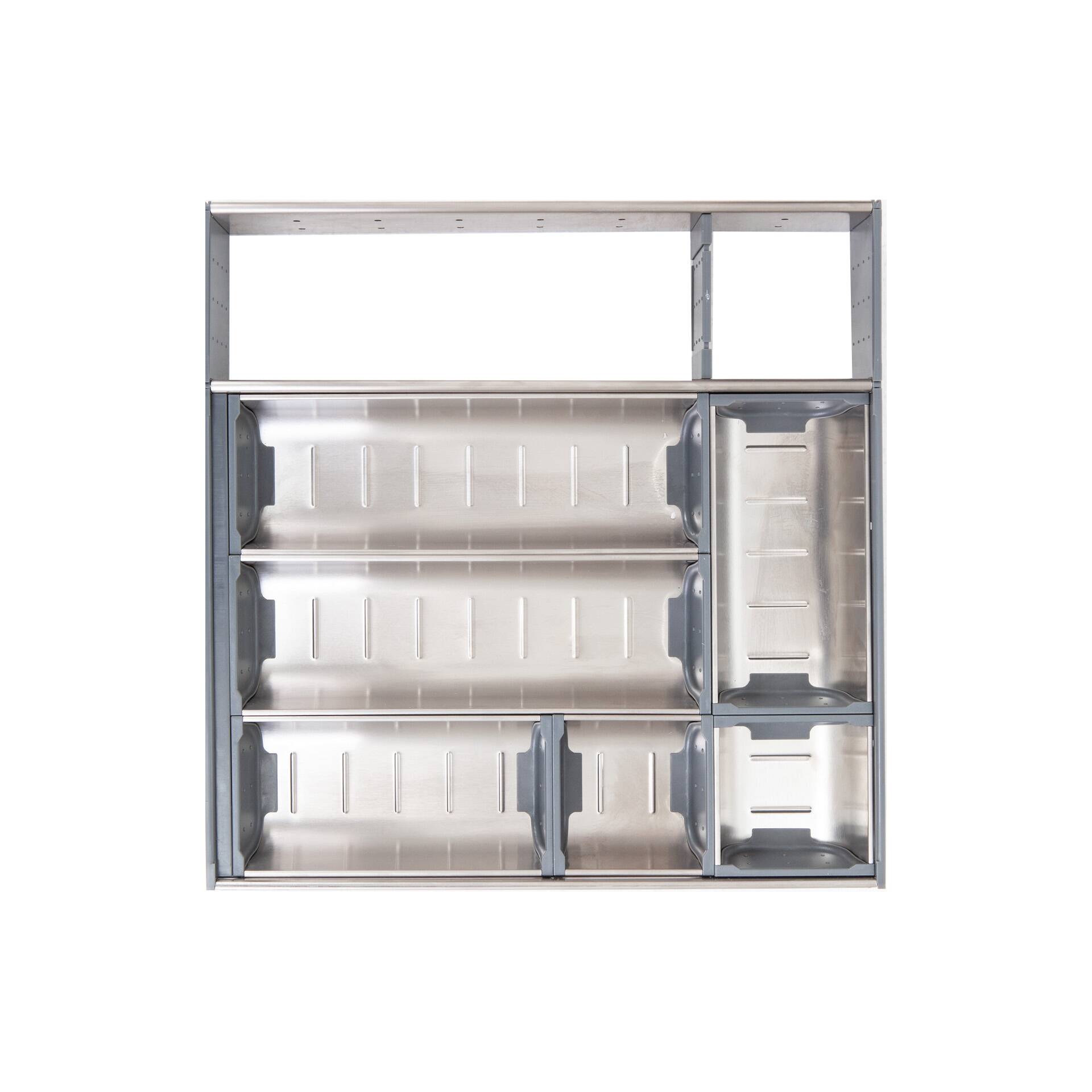 Система внутренних разделителей для ящиков из нержавеющей стали, предназначена для ящика со столовыми приборами, сборные лотки разной ширины позволяют организовать внутреннее пространство ящика.