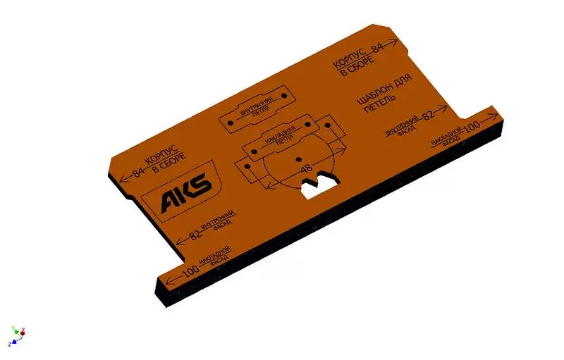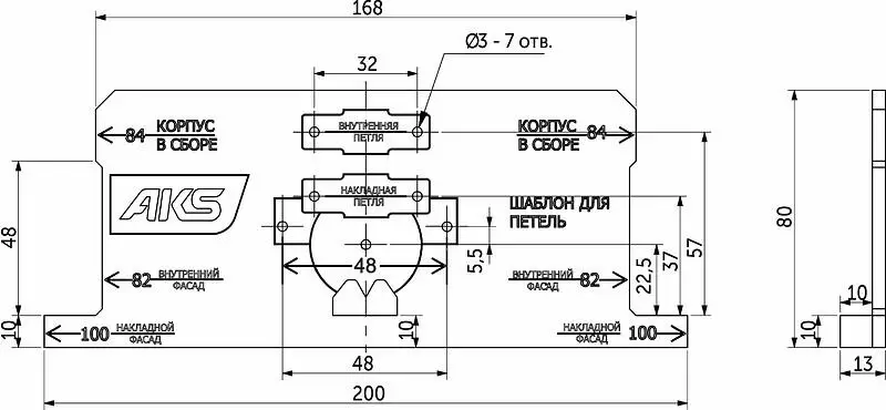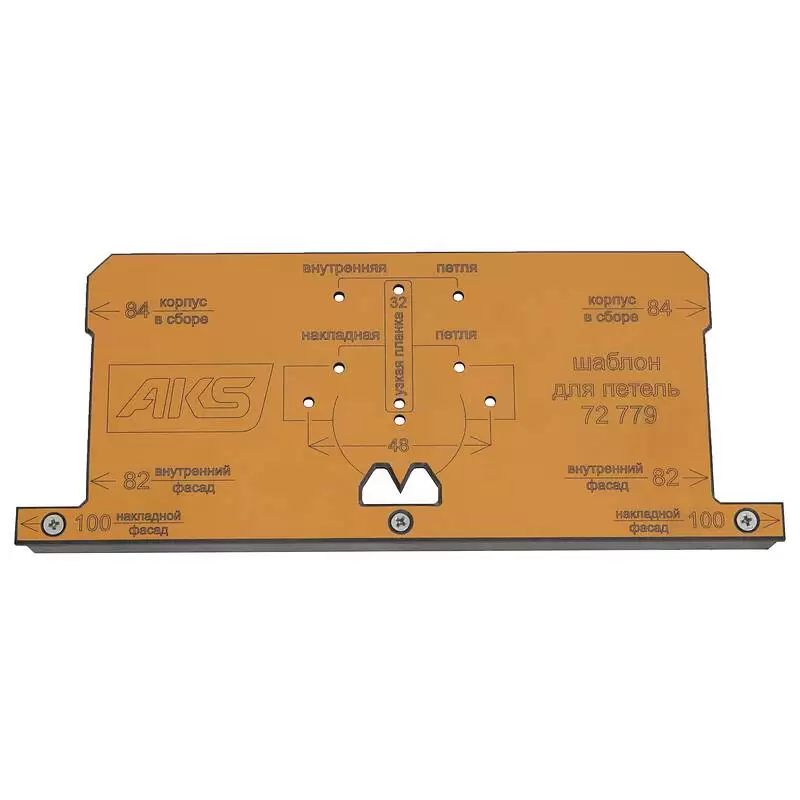 Для петель с присадкой 48 мм. Диаметр отверстий - 3 мм. Есть разметка под узкую планку петли 3D (и для обычных петель на узкой планке).