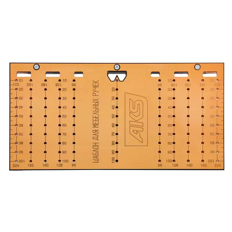 Мебельный шаблон для разметки мебельных ручек. Позволяет произвести разметку наиболее распространенных мебельных ручек. Изготовлен из ламинированного текстолита толщиной 3мм. Упорная планка из пластика.