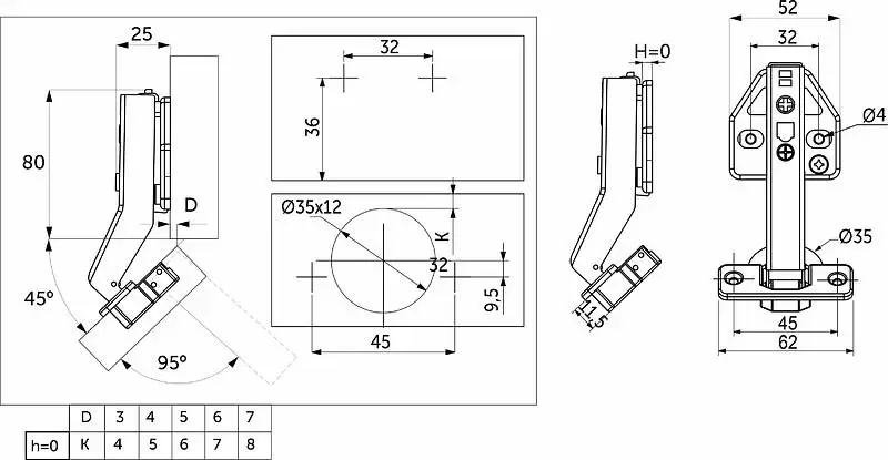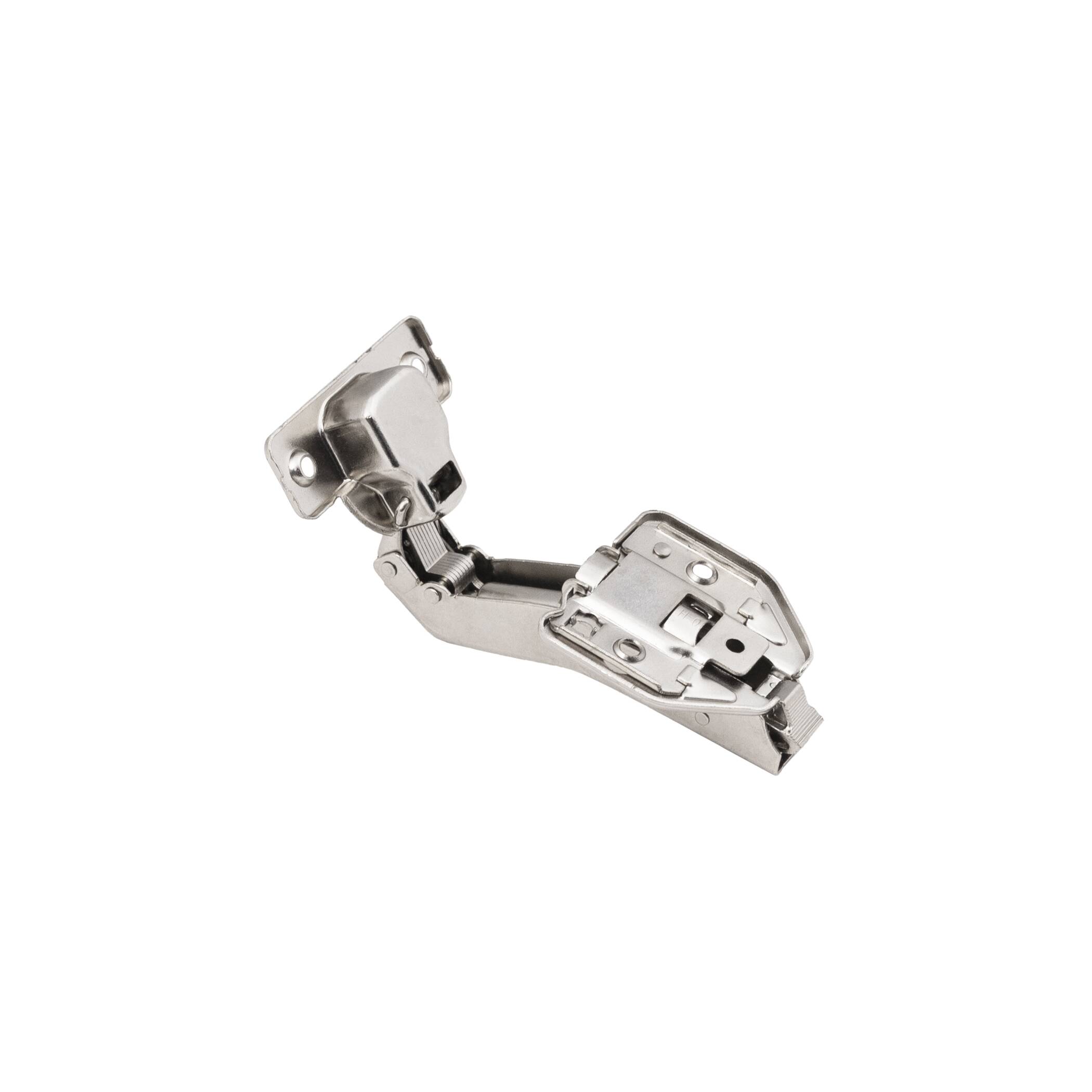 Петля угловая с доводчиком и системой быстрого монтажа clip on. Имеет современную систему регулировки в трех плоскостях при помощи эксцентриковых винтов в планке и теле петли. Межцентровое расстояние в чашке 45 мм. Петля имеет массу 138 грамм и изготовлена из высокопрочной холоднокатаной стали. Имеет встроенный демпфер, что обеспечивает плавность закрытия петли. Угол открывания 95 градусов. Устанавливается преимущественно под скошенные ящики угловые. В комплекте идут декоративные накладки на тело и на чашку для маскировки винтов крепления.
