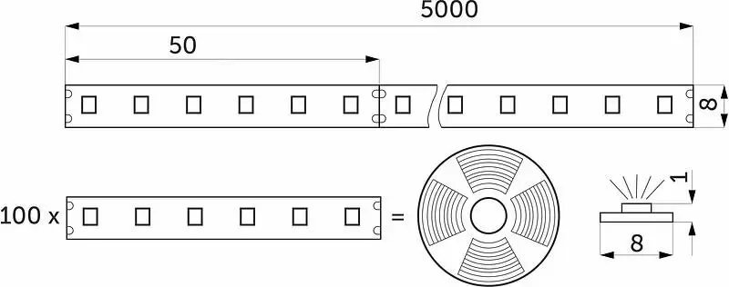 Ширина 8 мм, длина 5 м. Напряжение 12 В