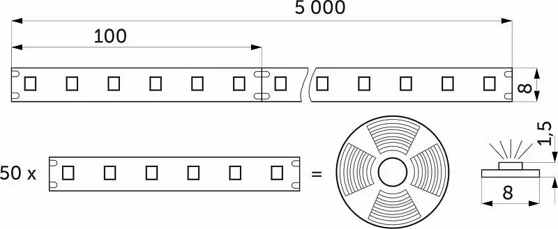Тип диодов 2835, количество диодов 300, напряжение 24В, степень защиты IP20, мощность 4,8W/m, ширина 8 мм, длина 5м, теплый белый (3000K) - 5м, CRI>80, 550 Lm.