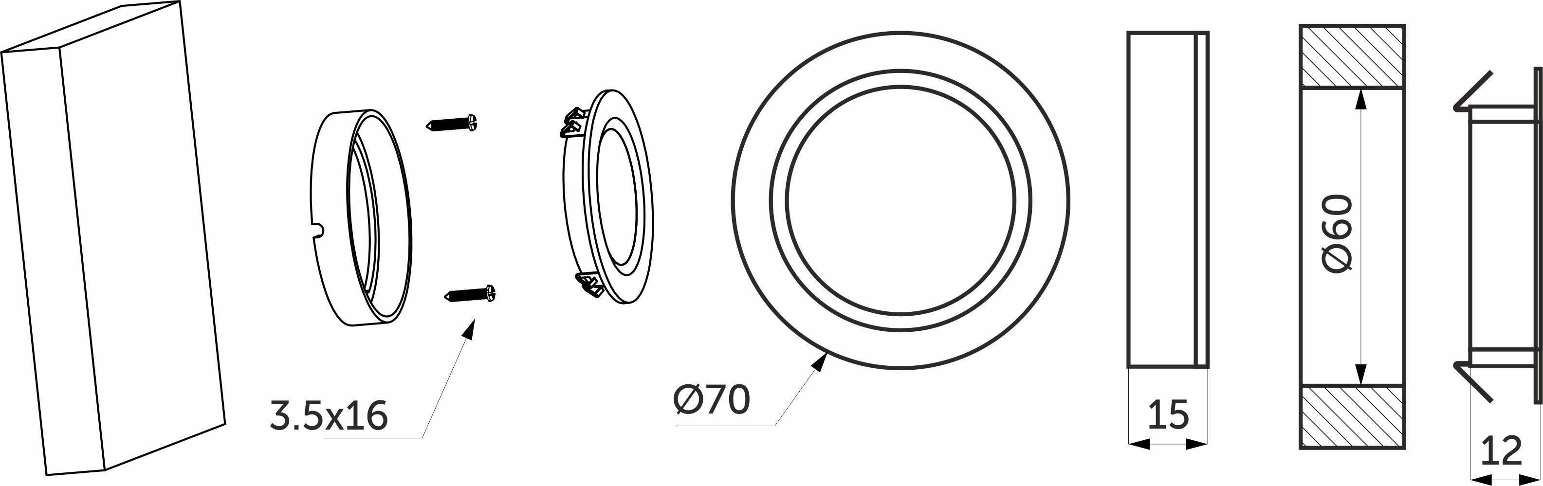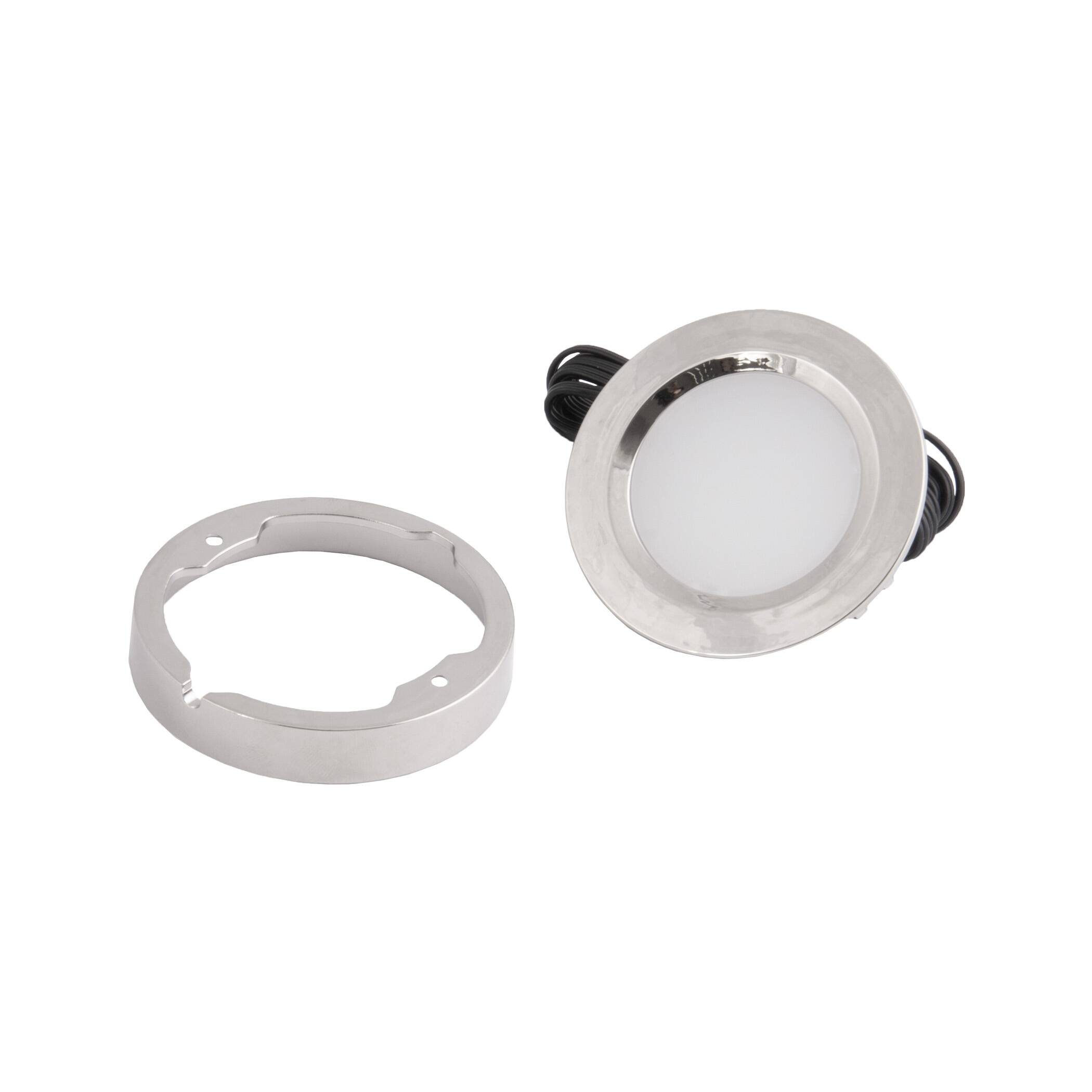 Длина мини-коннектора 2 м., световой поток 180 Lm, мощность 2W, напряжение 12V, степень защиты IP20, цвет корпуса хром, цвет свечения холодный белый (6000К), матовый рассеиватель, размеры накладного 70х14.6 мм, размеры врезного 60х10,5 мм.