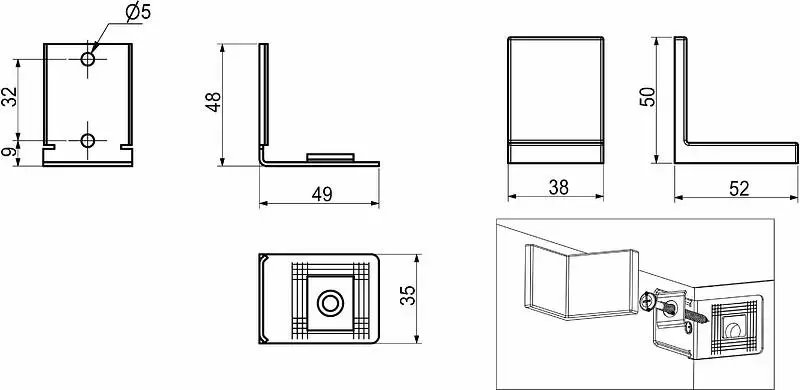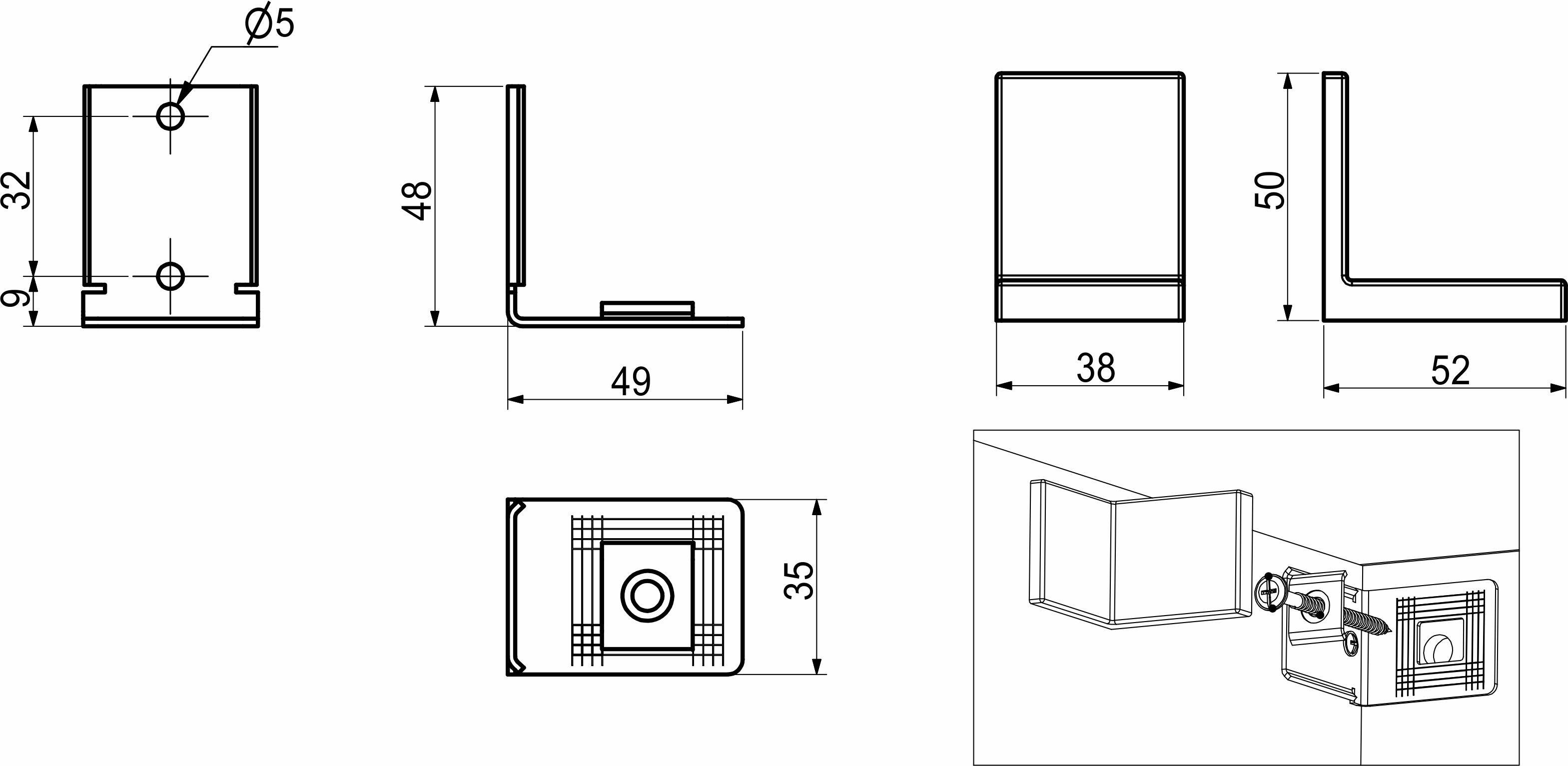 Предназначен для крепления корпусов навесных ящика к стене. Также может использоваться для стоящих на полу элементов мебели к стене и тогда навес выполняет функцию предотвращения опрокидывания элемента мебели. Состоит из трех элементов: уголок, фиксирующая шайба и декоративная крышка различных цветов. Нагрузка на пару - 50 кг. Регулировка по вертикали и горизонтали в пределах 3-4 мм за счет смещение фиксирующей шайбы