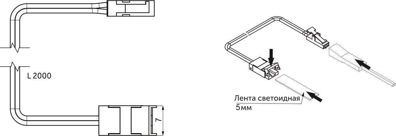 Для того, чтобы соединить светодиодную ленту, необходимо вставить с одной стороны шнура один кусок светодиодной ленты и зажать его. С другой стороны необходимо подключить блок питания с помощью коннектора. Длина 2 метра.