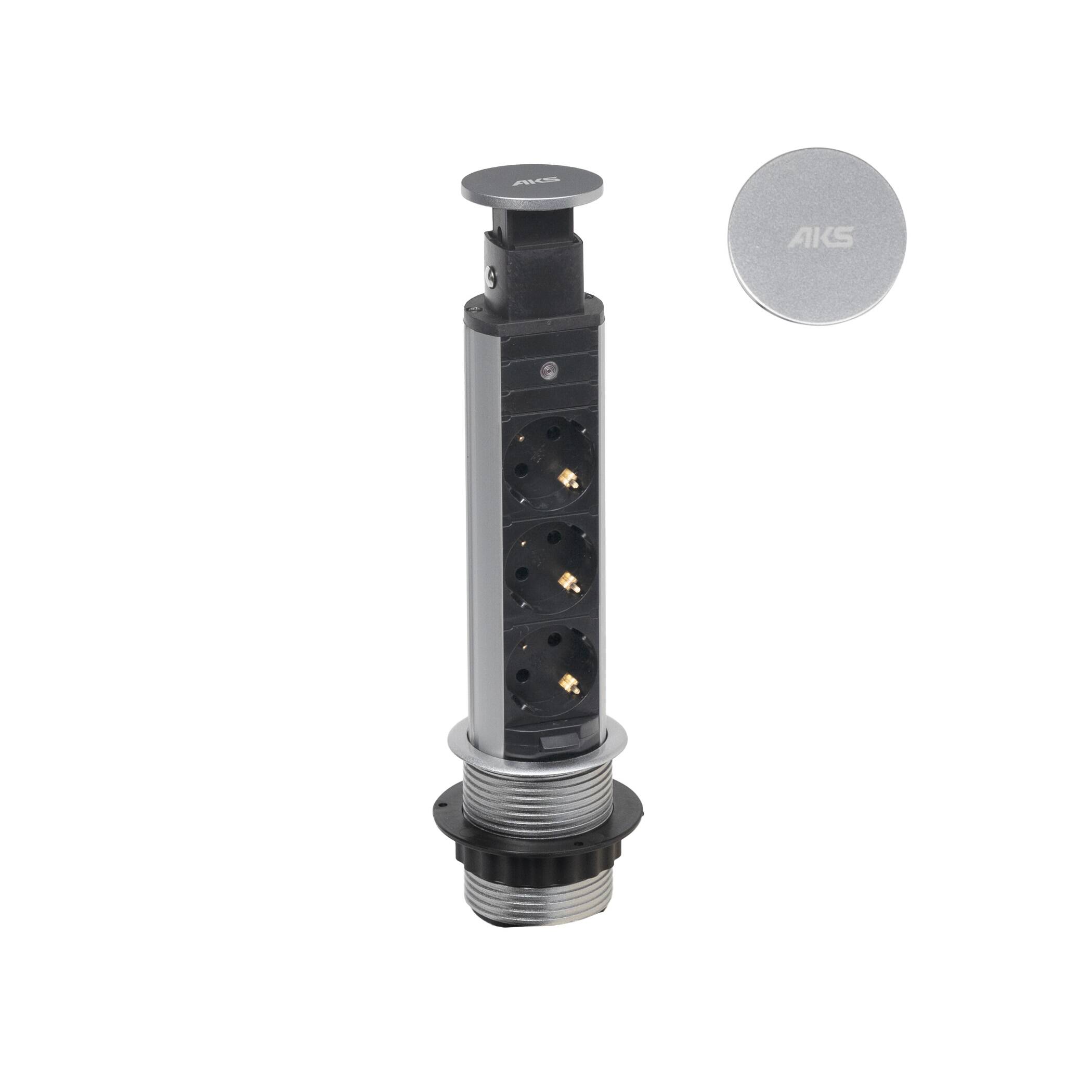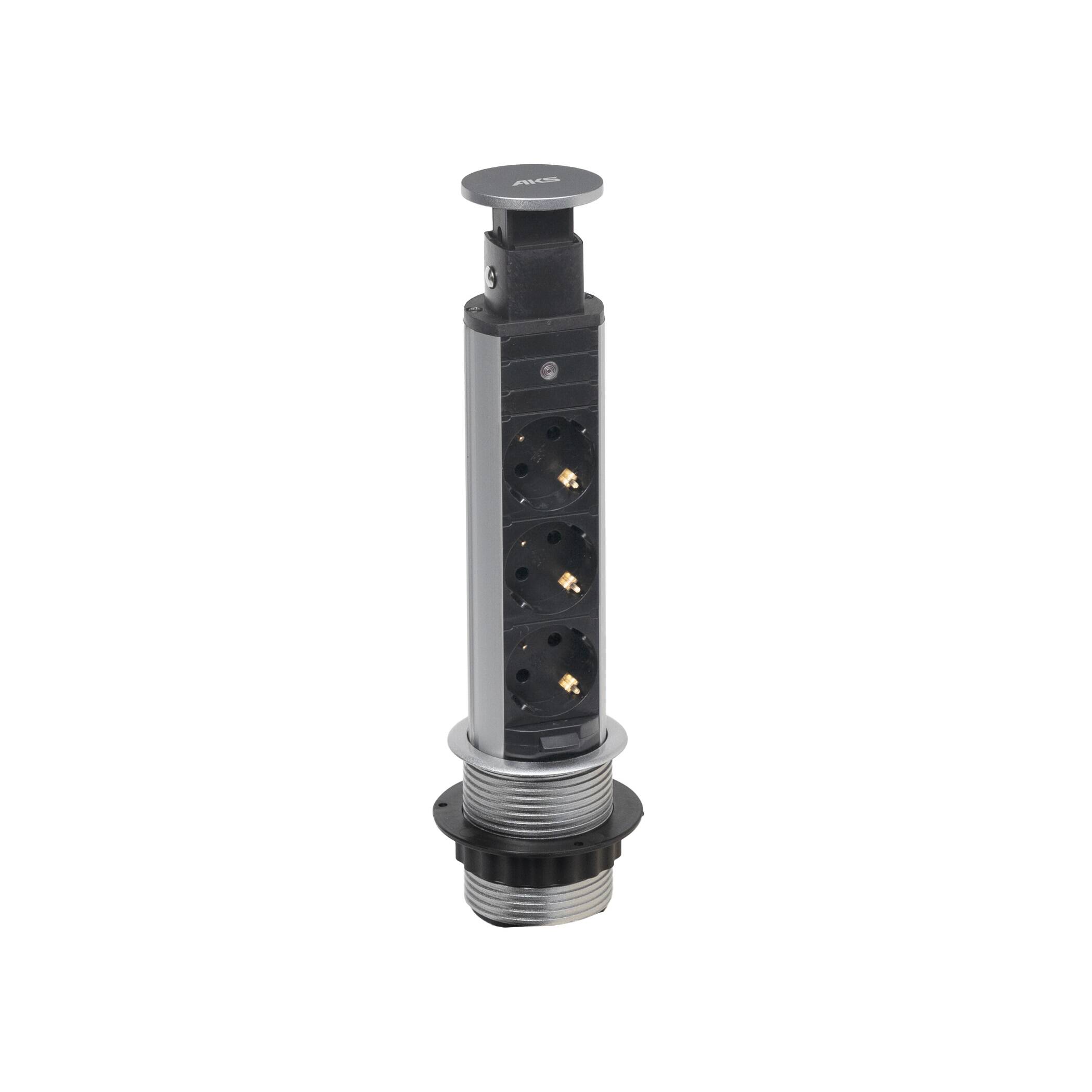 Настольный скрытый разветвитель AKS Vulcan, 60 мм 3 розетки (Schuko) цвет алюминий, входное напряжение 220В, выходное напряжение 220В, максимальная сила тока 16А, длина шнура 1.5м, макс. мощность 3600Вт.