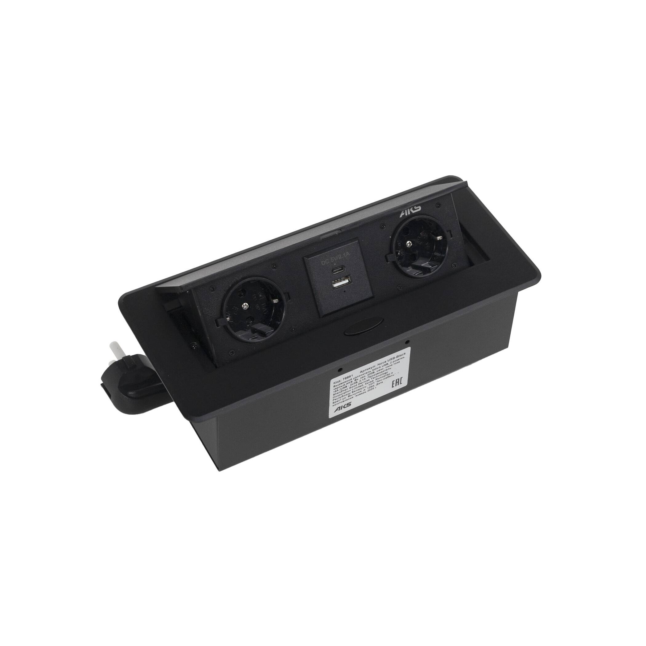 2 евророзетки с заземлением 220В (Schuko), USB A + USB C, цвет черный.