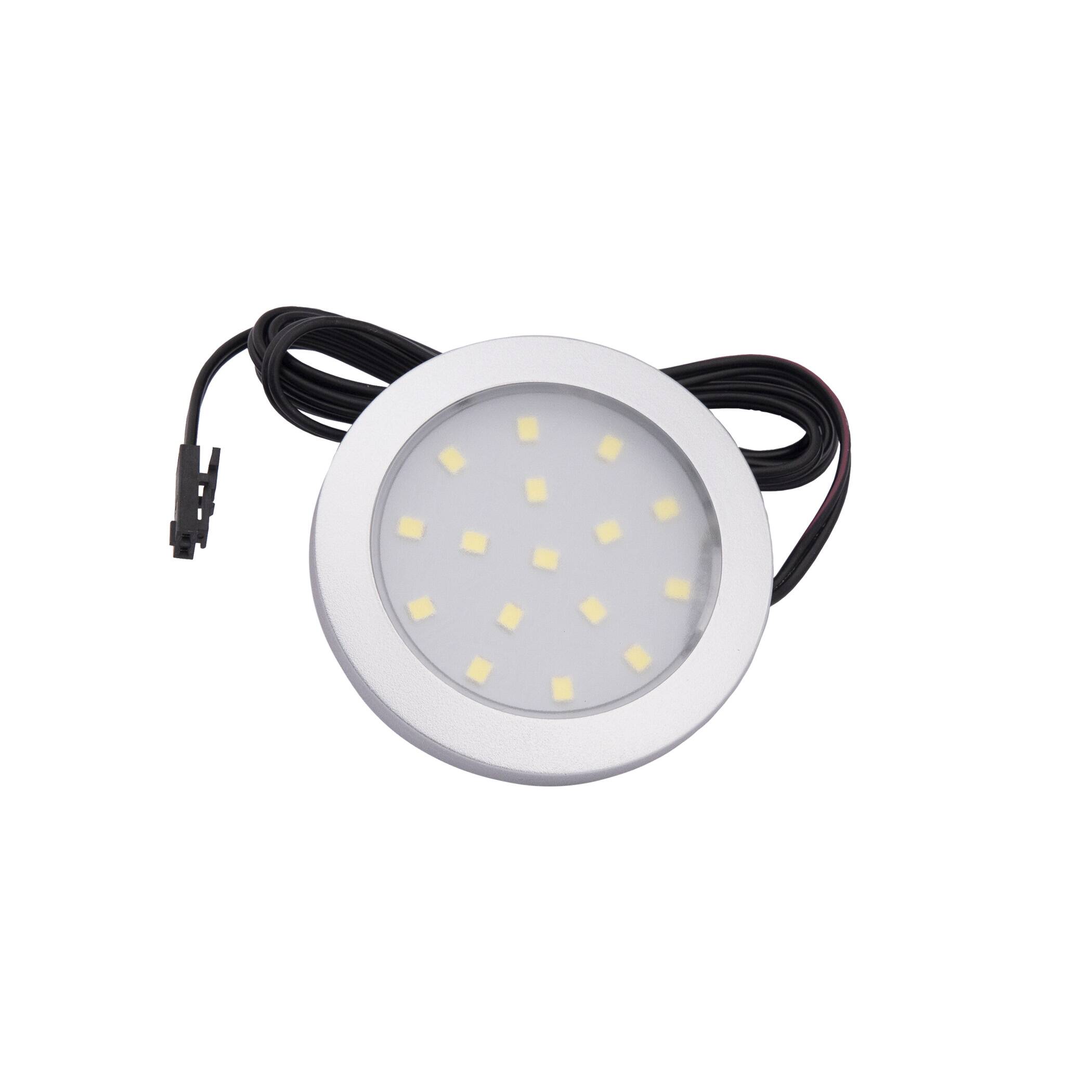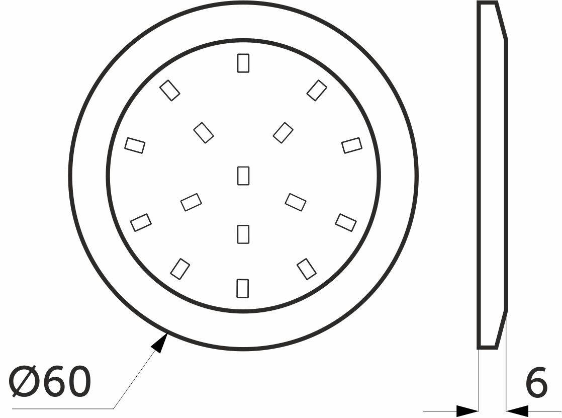 Светильник светодиодный, накладной, размеры 60х5,5мм, напряжение 12V постоянного тока, мощность 1,5W, степень защиты IP20, холодный белый 6500К, цвет хром, шнур с коннектором 1м.