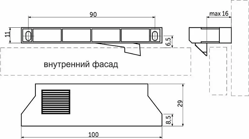 Ручка-поводок (8,5 мм) серая для тонких алюминиевых фасадов внутреннего ящика с общим расстоянием между фасадами от 8,5 до 16 мм.