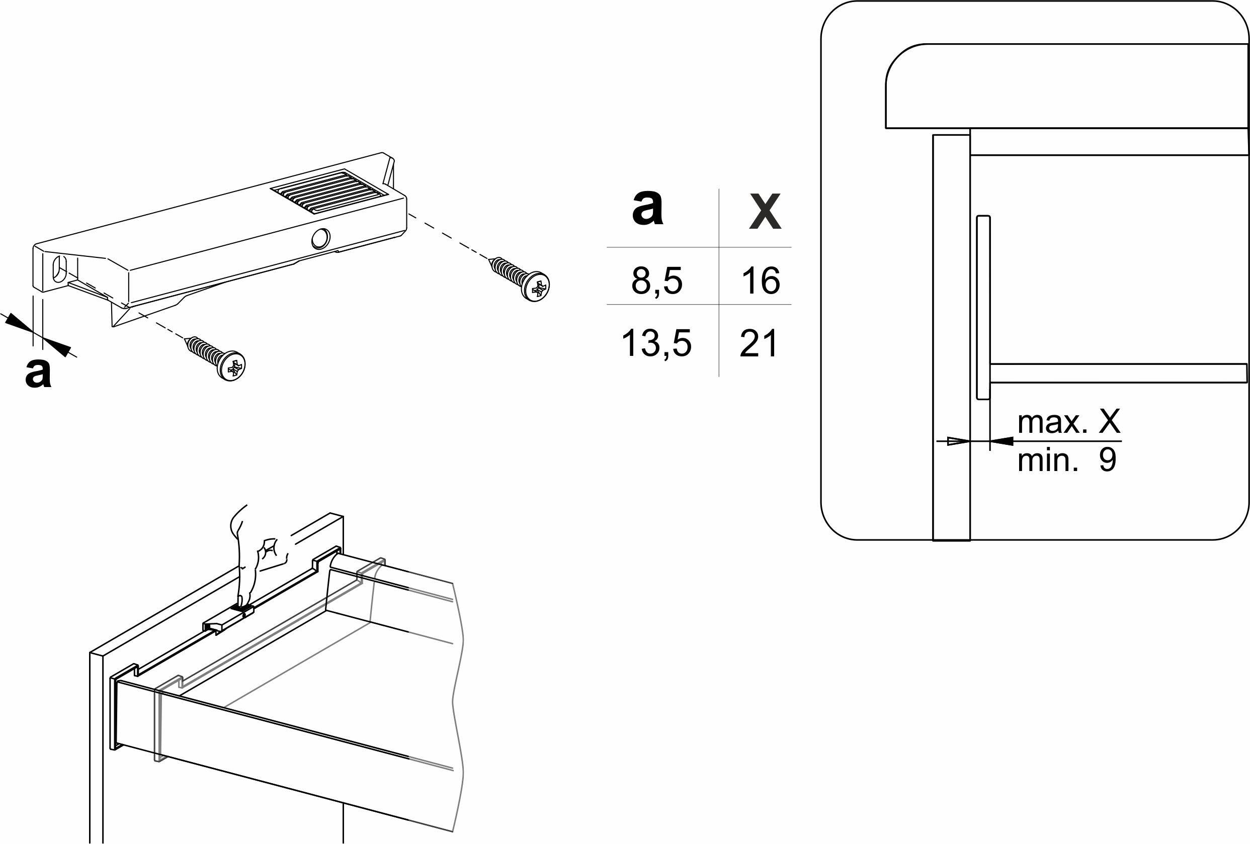 Ручка-поводок (13,5 мм) для фасадов внутреннего ящика из ДСП с общим расстоянием между фасадами от 13,5 до 21 мм. Освободив поводок, вы можете закрыть внутренний ящик отдельно от фасада. Отлично сочетается в том числе и с системами SLIMBOX.