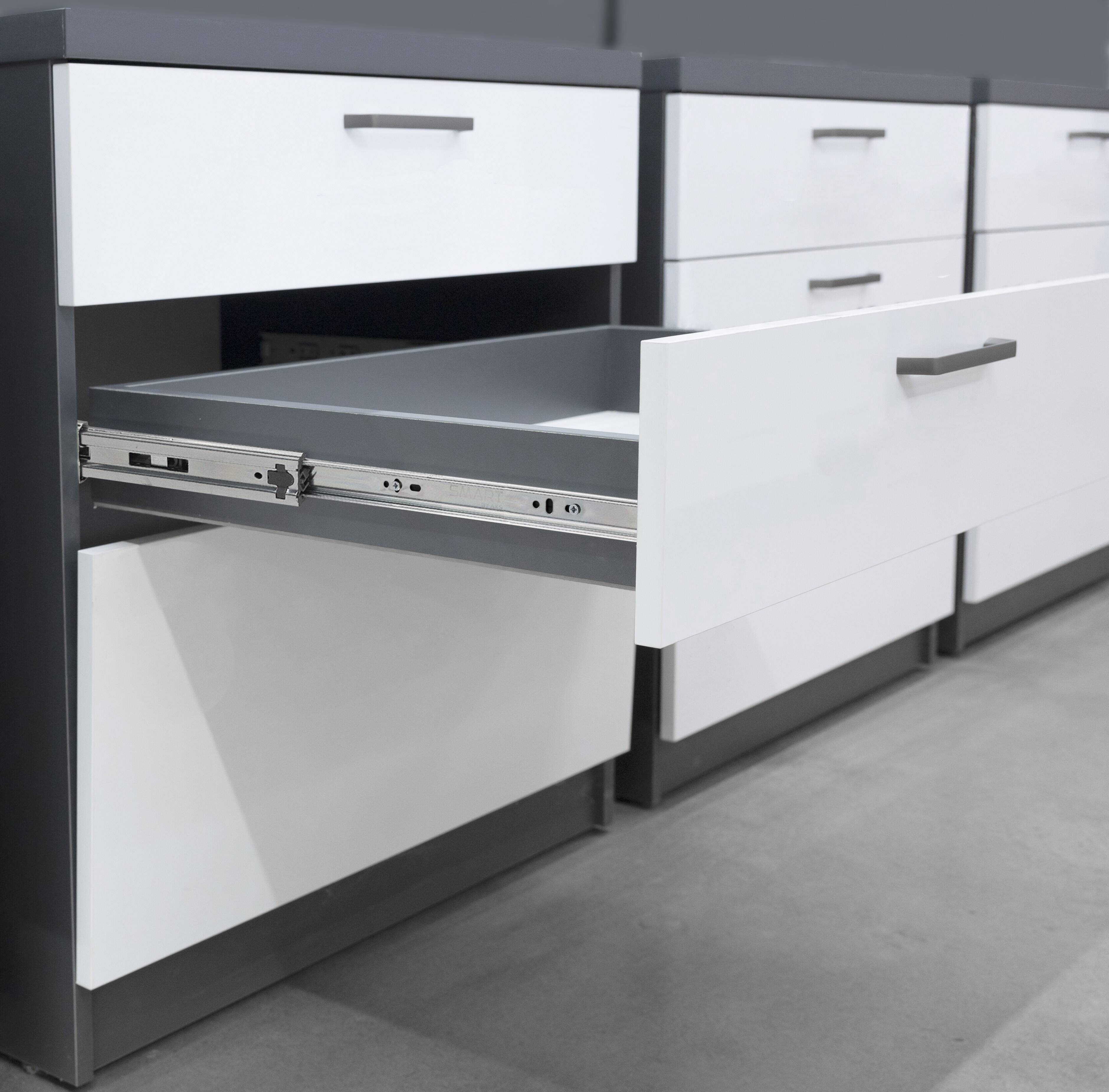 Системы выдвижения, объединившие в себе функции автоматического закрывания (soft closing) и открывания без использования лицевой фурнитуры (push to open). Нагрузка до 30 кг. Срок эксплуатации шариковых направляющих не менее 60 000 циклов. Лёгкий монтаж / демонтаж.
