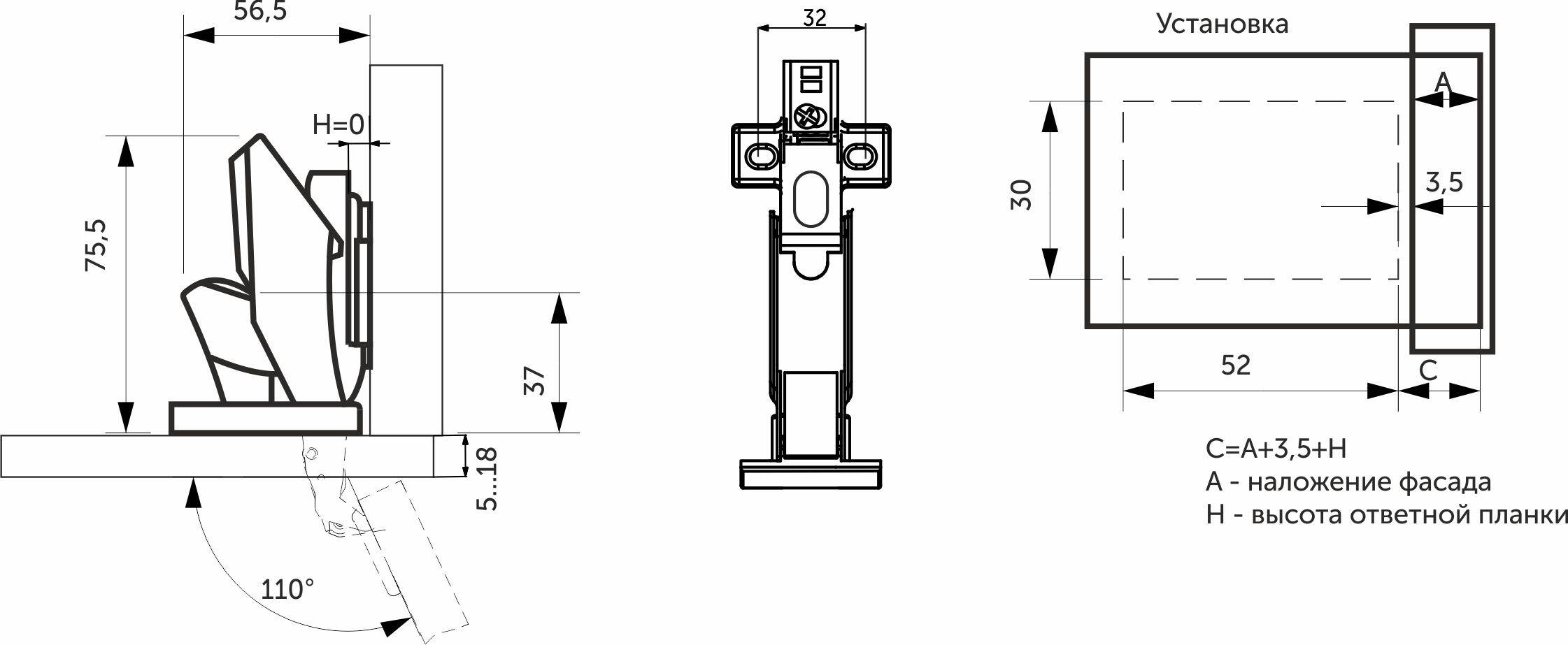 Петля накладная с доводчиком для открывания стеклянных( и иных) фасадов толщиной от 5 до 18 мм. Встроенная в консоль регулировка по глубине +3/-2 мм координирует глубину фасада относительно корпуса шкафа, встроенная регулировка в теле петли +/-2 мм позволяет оставлять узкие боковые зазоры, высота регулируется с помощью монтажных планок +/-3 мм. Фасад устанавливается и снимается с каркаса без инструментов, с помощью скрытой техники защелкивания clip on. Материал - сталь, отделка - никель, угол открывания - 110 градусов.