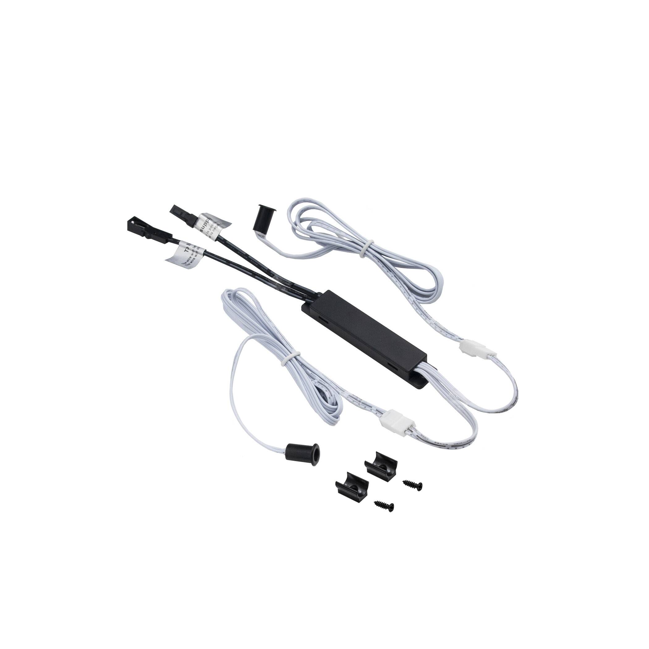 Датчик движения двойной черный с креплением, срабатывает на преграду для шкафов, по датчику на дверцу, дистанция срабатывания до 50 мм, рабочее напряжение 12-24VDC, мощность 60W, степень защиты IP20, способ установки врезной или накладной, размер установочного отверстия 8мм, глубина 13 мм, длина провода до блока управления 1 м, длина проводов от блока управления до источника света и блока питания по 100 мм.
