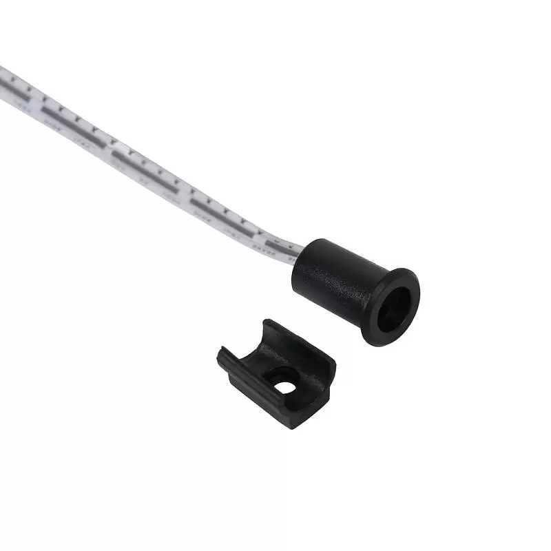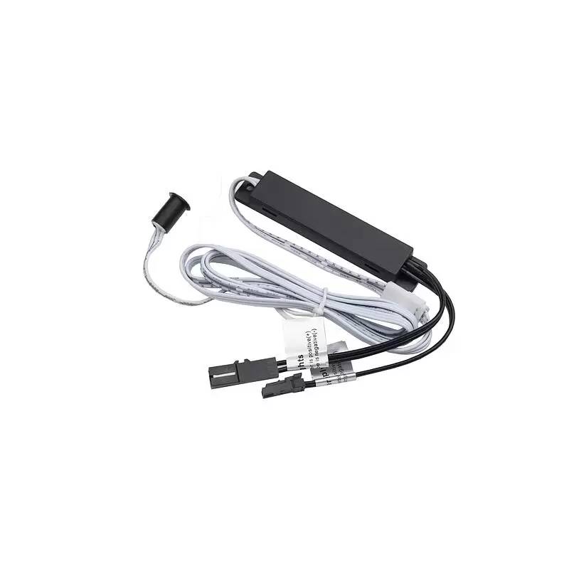 Датчик движения черный с креплением, срабатывает на взмах руки, дистанция срабатывания до 50 мм, рабочее напряжение 12-24VDC, мощность 60W, степень защиты IP20, способ установки врезной или накладной, размер установочного отверстия 8мм, глубина 13 мм, длина провода до блока управления 1 м, длина проводов от блока управления до источника света и блока питания по 100 мм.