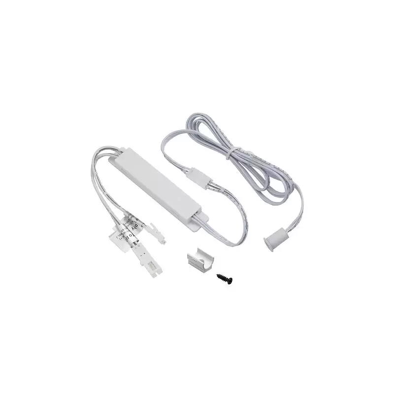 Датчик движения белый с креплением, срабатывает на взмах руки, дистанция срабатывания до 45 мм, рабочее напряжение 12-24VDC, мощность 60W, степень защиты IP20, способ установки врезной или накладной, размер установочного отверстия 8мм, глубина 13 мм, длина провода до блока управления 1 м, длина проводов от блока управления до источника света и блока питания по 100 мм.