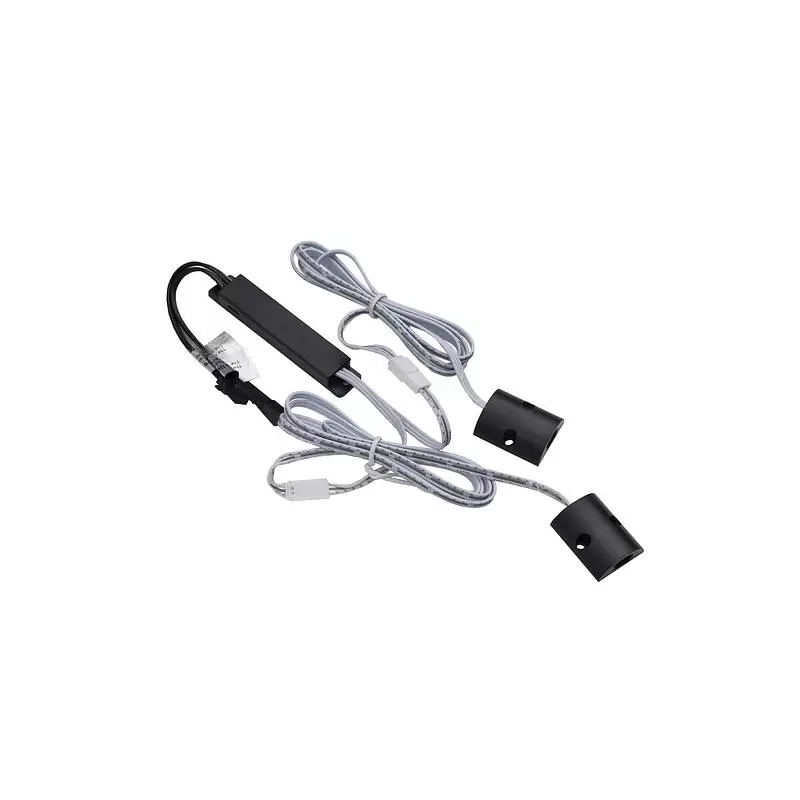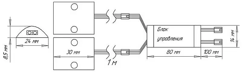 Датчик движения белый накладной двойной, по датчику на каждую дверку, срабатывает на преграду для шкафов, дистанция срабатывания до 50 мм, рабочее напряжение 12-24VDC, мощность 60W/100W, степень защиты IP20, способ установки накладной, размер 30х24х8,5 мм, длина провода до блока управления 1 м, длина проводов от блока управления до источника света и блока питания по 100 мм.