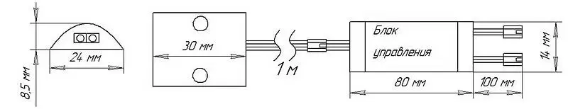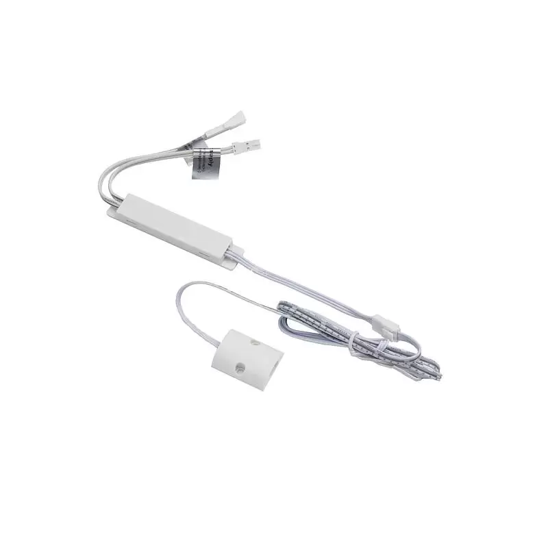 Датчик движения белый, срабатывает на преграду для шкафов, дистанция срабатывания до 70 мм, рабочее напряжение 12-24VDC, мощность 60W, степень защиты IP20, способ установки накладной, размер 30х24х8,5 мм, длина провода до блока управления 1 м, длина проводов от блока управления до источника света и блока питания по 100 мм.