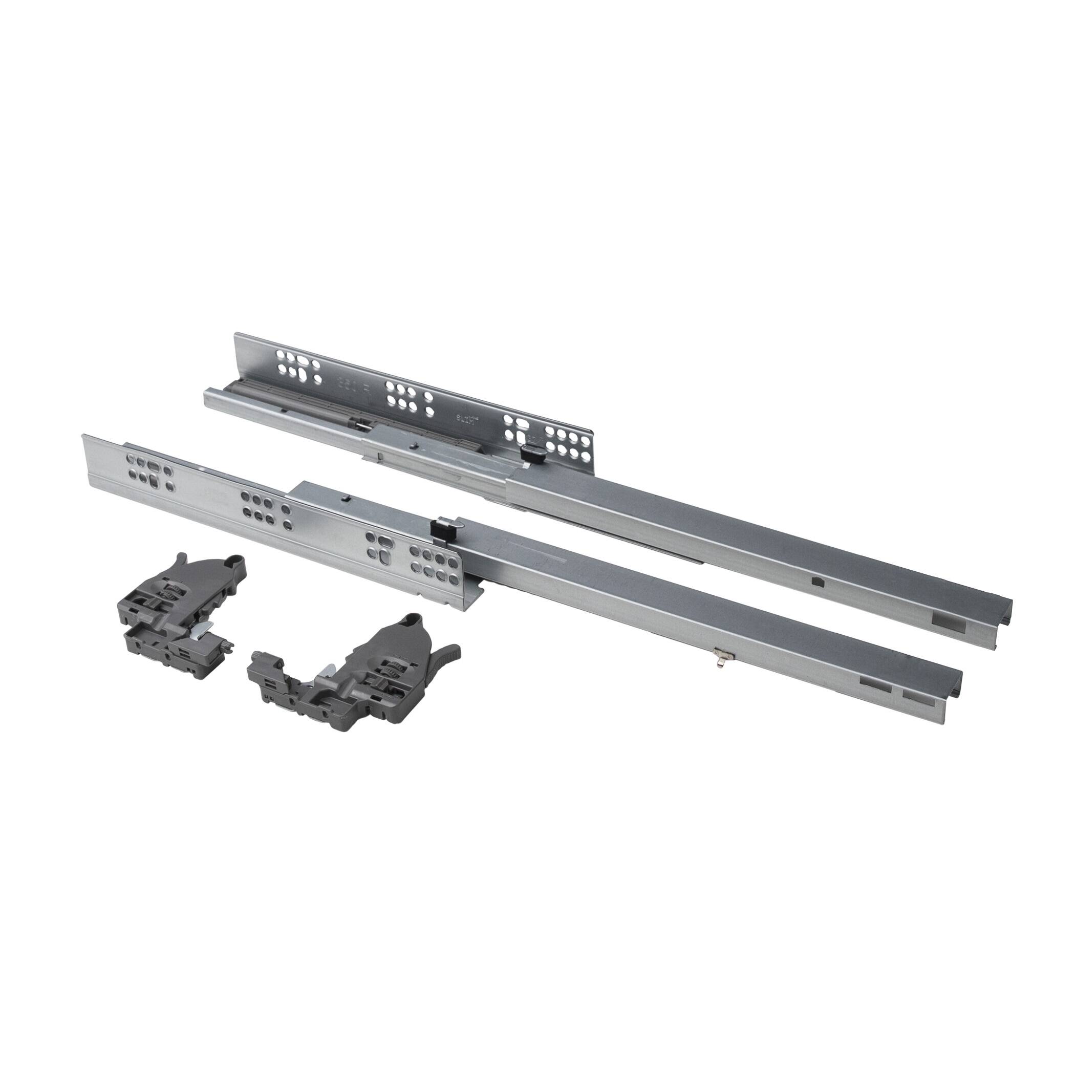Направляющие скрытого монтажа полного выдвижения с доводчиком. Тихий ход за счет новой конструкции сепаратора. Синхронизатор встроен в направляющую. Нагрузка 45 кг. Рассчитан на 80 000 циклов (испытан в собственной лаборатории).