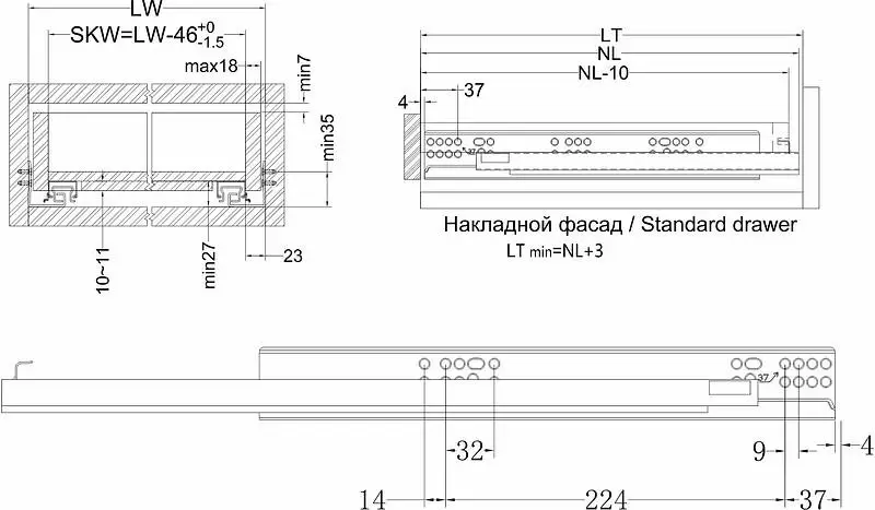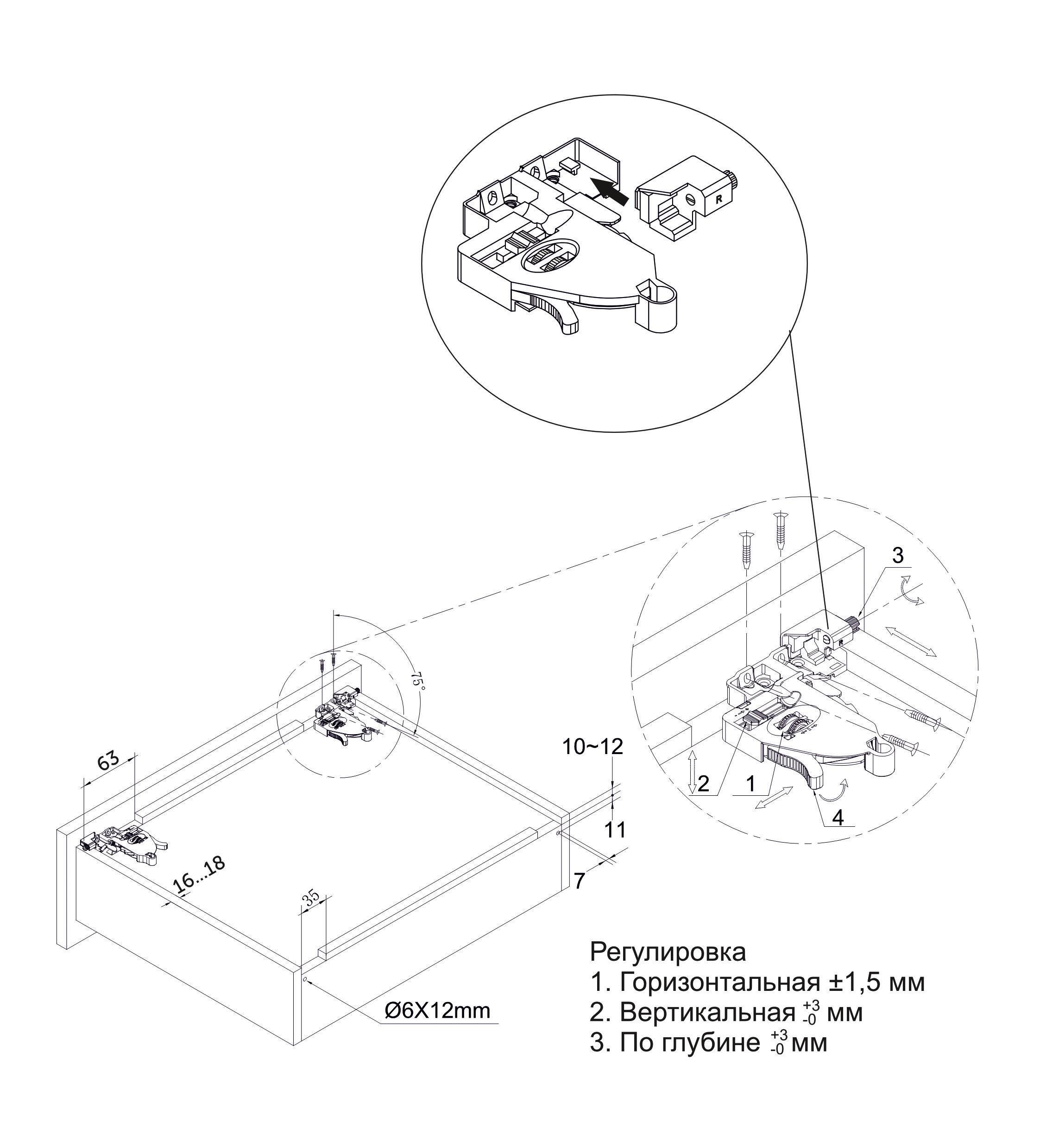 Под плиты от 16 до 18 мм. Регулировка фасада: горизонтально - 3 мм, вертикально - 3 мм, по глубине - 3 мм. Замки на металлической основе (нет деформации).