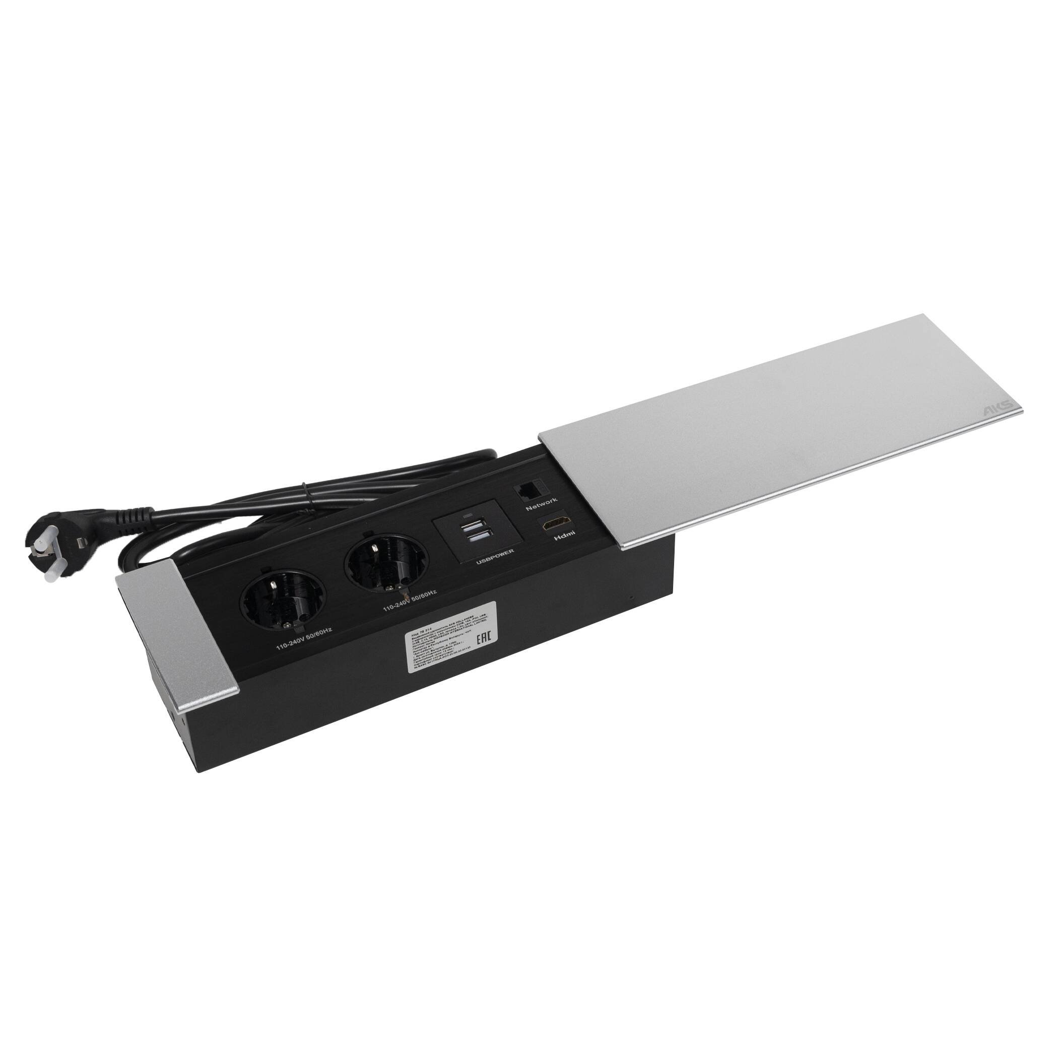 Наружный размер 280х100мм, монтажный размер 268х60х65мм, степень защиты IP20, длина кабеля 1,8м, электробезопасность 16A с заземлением и проводами с поперечным сечением 1,5 mm². тип гнезда: Schuko, USB 2 x 5V DC 2,1A, HDMI, LAN, цвет шлифованная сталь.