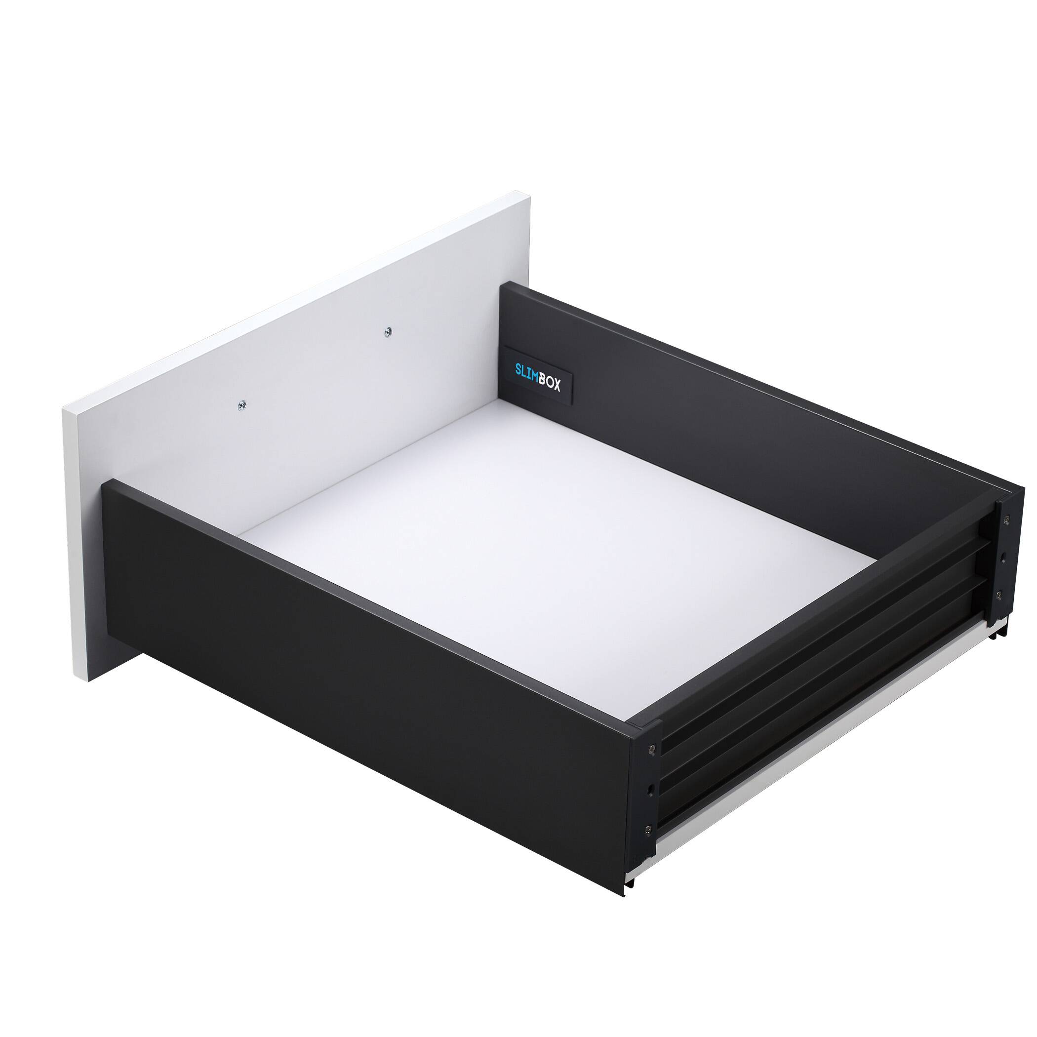 Slimbox с системой открытия от нажатия (push-to-open) представляет собой готовый комплект системы выдвижения с тонкими стальными боковинами. Толщина боковины в 13,5 мм позволяет увеличить полезное пространство ящика на 20%. Цвет: графит, высота ящика: 128 мм, длина направляющей: 450 мм.