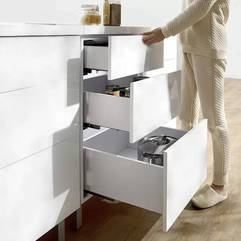 Наличие внутренней панели с креплениями позволяет изготовить внутренние ящики соответствующей высоты. Встроенная синхронизация в направляющих гарантирует стабильную плавность хода даже в ящиках увеличенной ширины. Ящик рассчитан на 45 кг постоянной эксплуатационной нагрузки и обеспечивает бесперебойную работу на протяжении 100 000 циклов открывания/закрывания. Пространство внутри ящика помогут организовать шуфлядные вкладыши Organizer из нержавеющей стали.