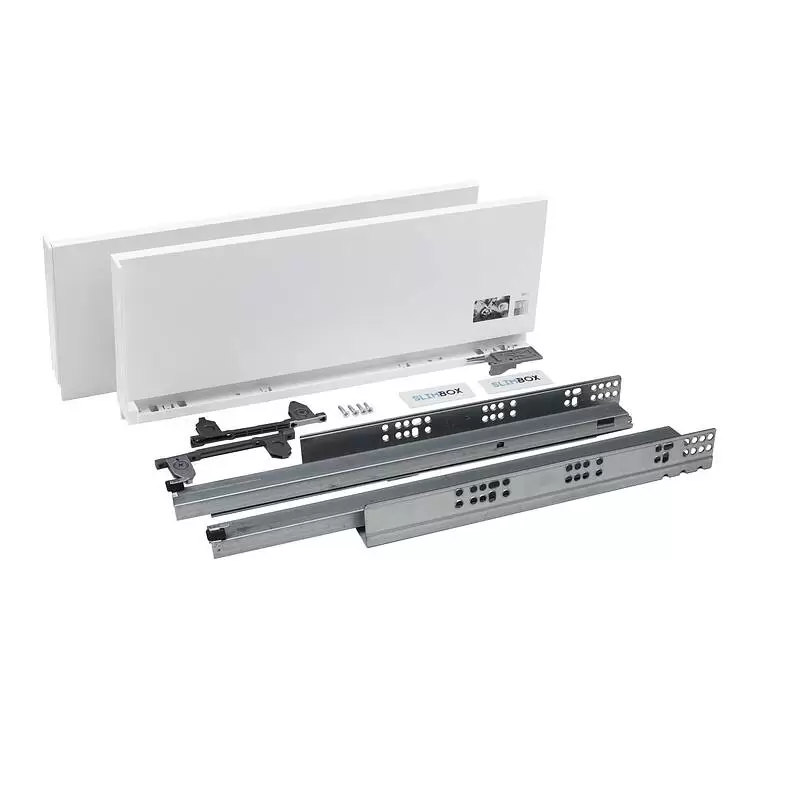 Slimbox с системой открытия от нажатия (push-to-open) представляет собой готовый комплект системы выдвижения с тонкими стальными боковинами. Толщина боковины в 13,5 мм позволяет увеличить полезное пространство ящика на 20%. Цвет: белый, высота ящика: 175 мм, длина направляющей: 400 мм.