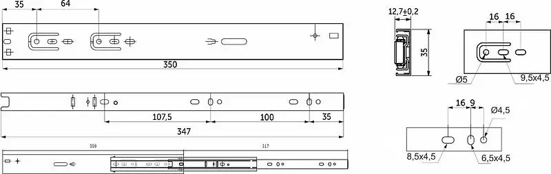 Направляющие для ящиков в 35-мм высоте оснащены доводчиком двухпружинным. Имеет усиленные толщины 1,2 мм из холоднокатаной стали. Направляющие рассчитаны на постоянную нагрузку в 25 кг со сроком службы минимум 40 000 циклов. Имеют шарикоподшипниковые механизмы и телескопическую структуру, что обеспечивает полное выдвижение ящика. Функция сброса и бесшумного самодоката.