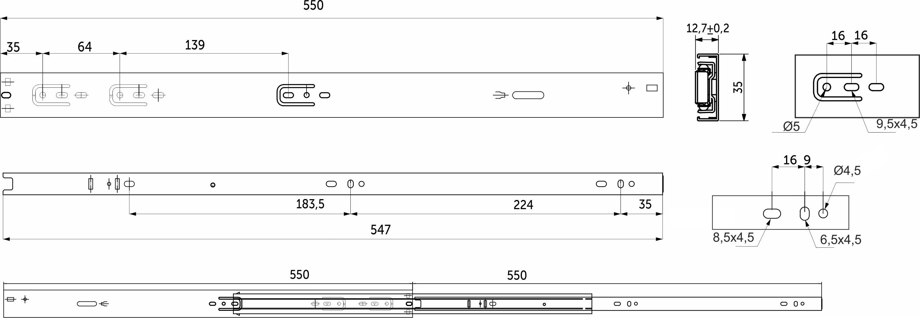 Направляющие для ящиков в 35-мм высоте оснащены доводчиком двухпружинным.  Имеет усиленные толщины 1,2 из холоднокатаной стали. Направляющие рассчитаны на постоянную нагрузку в 25 кг со сроком службы минимум 40 000 циклов. Имеют шарикоподшипниковые механизмы и телескопическую структуру, что обеспечивает полное выдвижение ящика. Длина - 550 мм. Функция сброса и бесшумного самодоката.